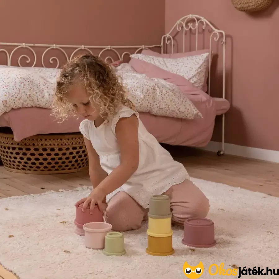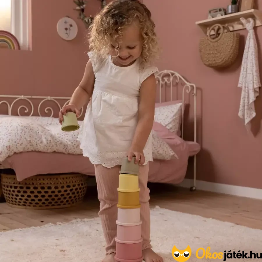 A különböző méretű poharakat csökkenő sorrendben egymásra helyezve a gyermek egy 43cm magas tornyot építhet.