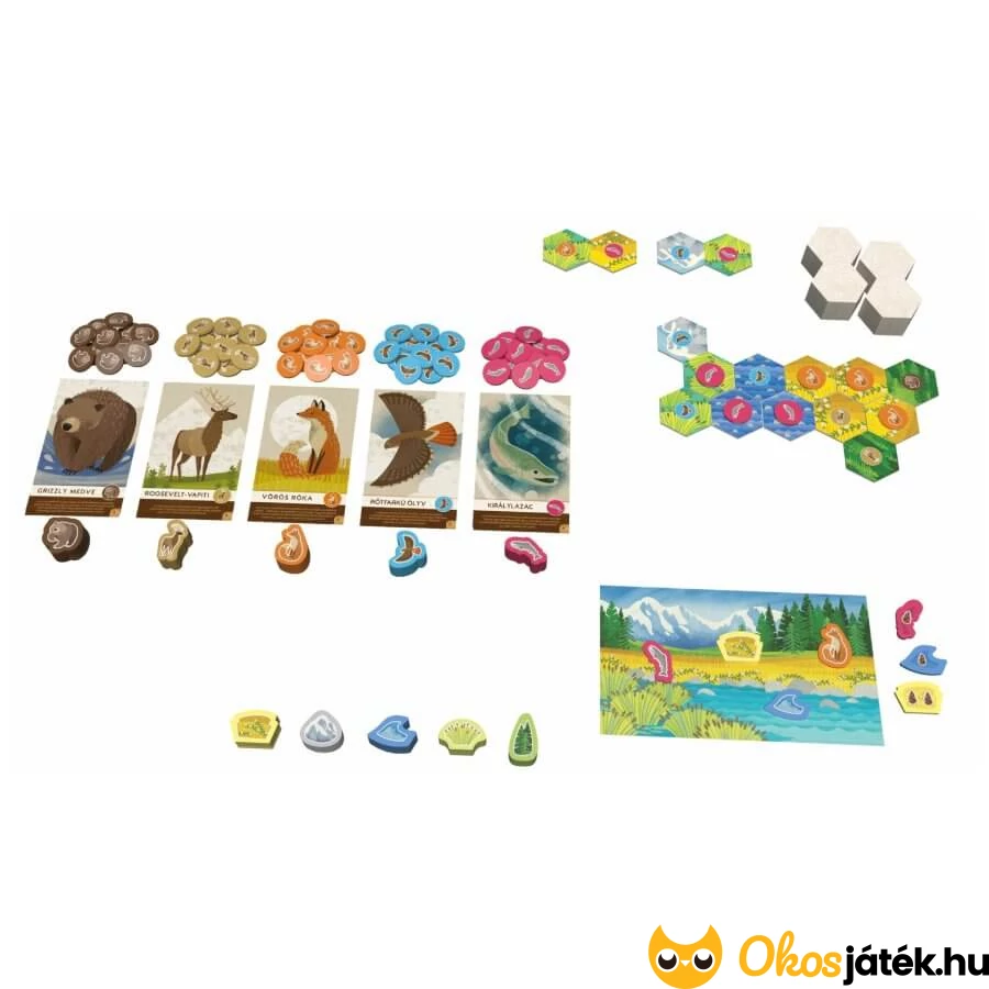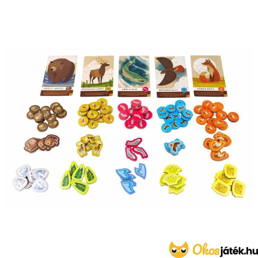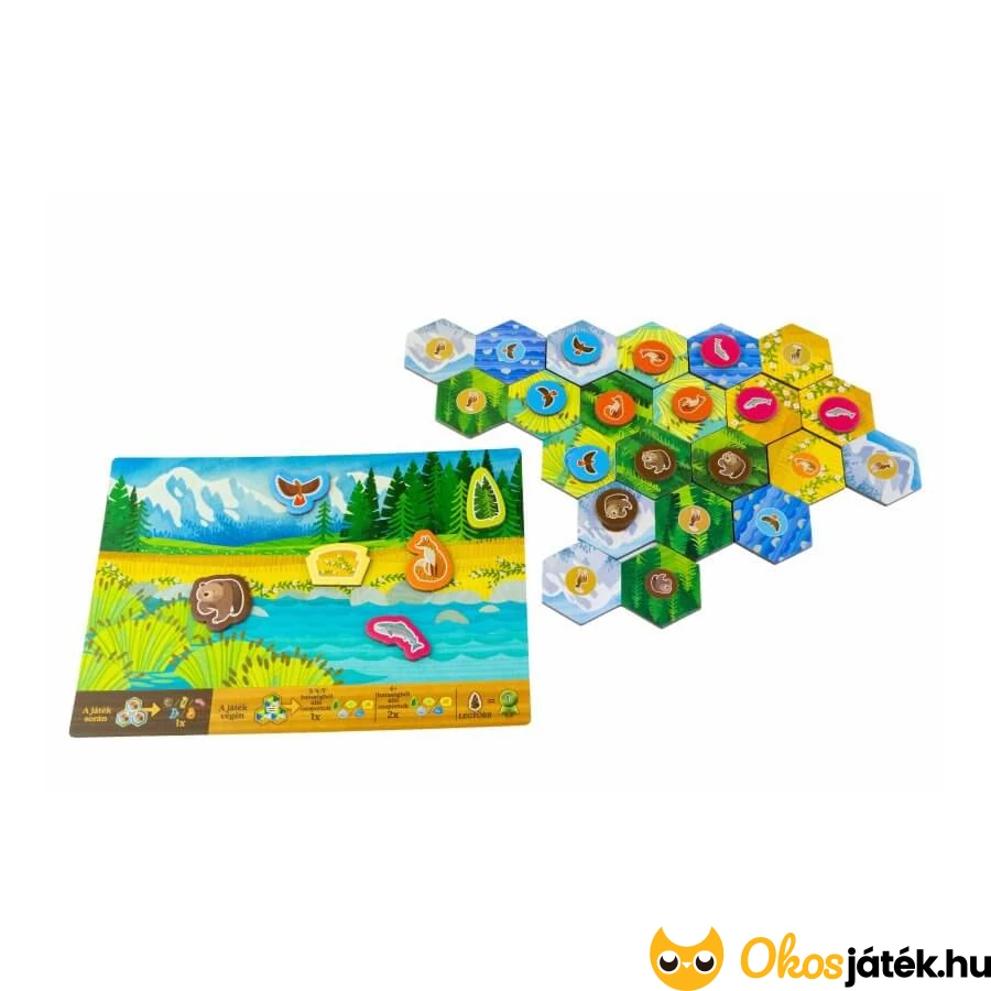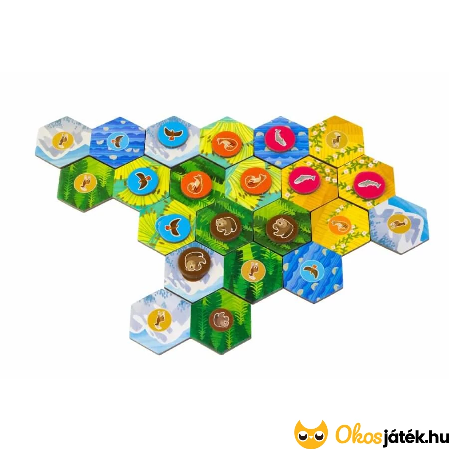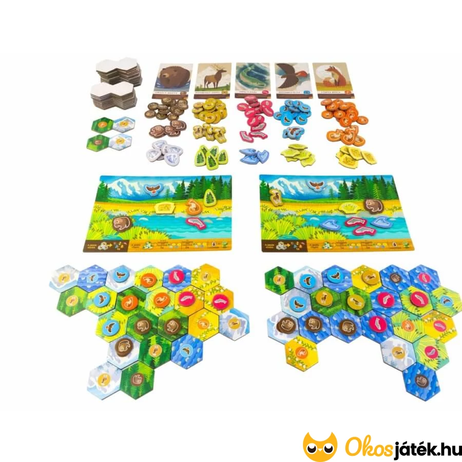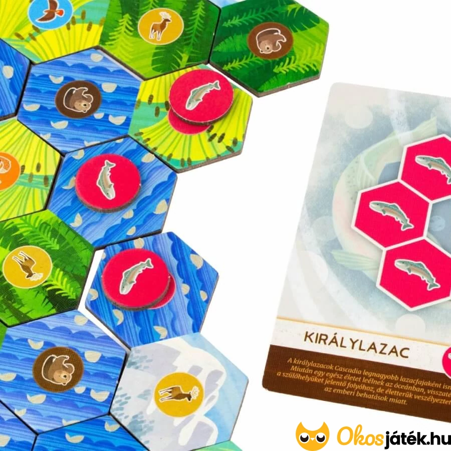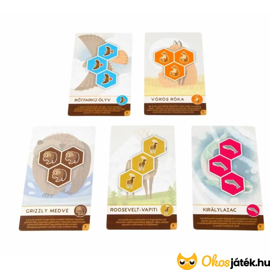 A Cascadia társasjáték könnyített, egyszerűsített játékváltozata kimondottan kisebbeknek, de lehet nehezíteni is, hiszen az állatkártyáknak két oldala van - a B oldalon már az alakzatokra is figyelni kell majd.