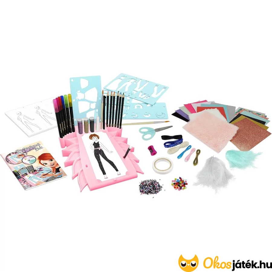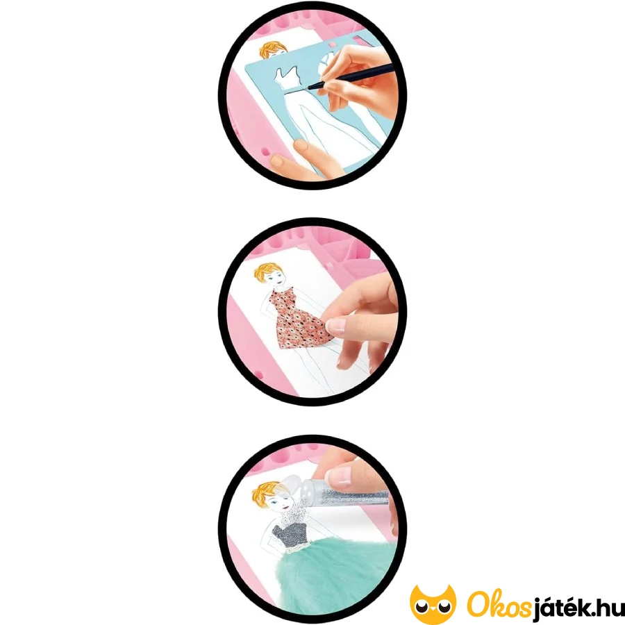 A divattervező készletben található 4 sablonnal, 30 egyedi ruhakölteményt alkothatnak a gyerekek. Különböző frizurákkal, más és más anyagú öntapadós anyagokkal, gombokkal, szalagokkal, csillámporokkal díszíthetik a női alakokat. További díszítési lehetőséget nyújtanak a filcek, ceruzák.