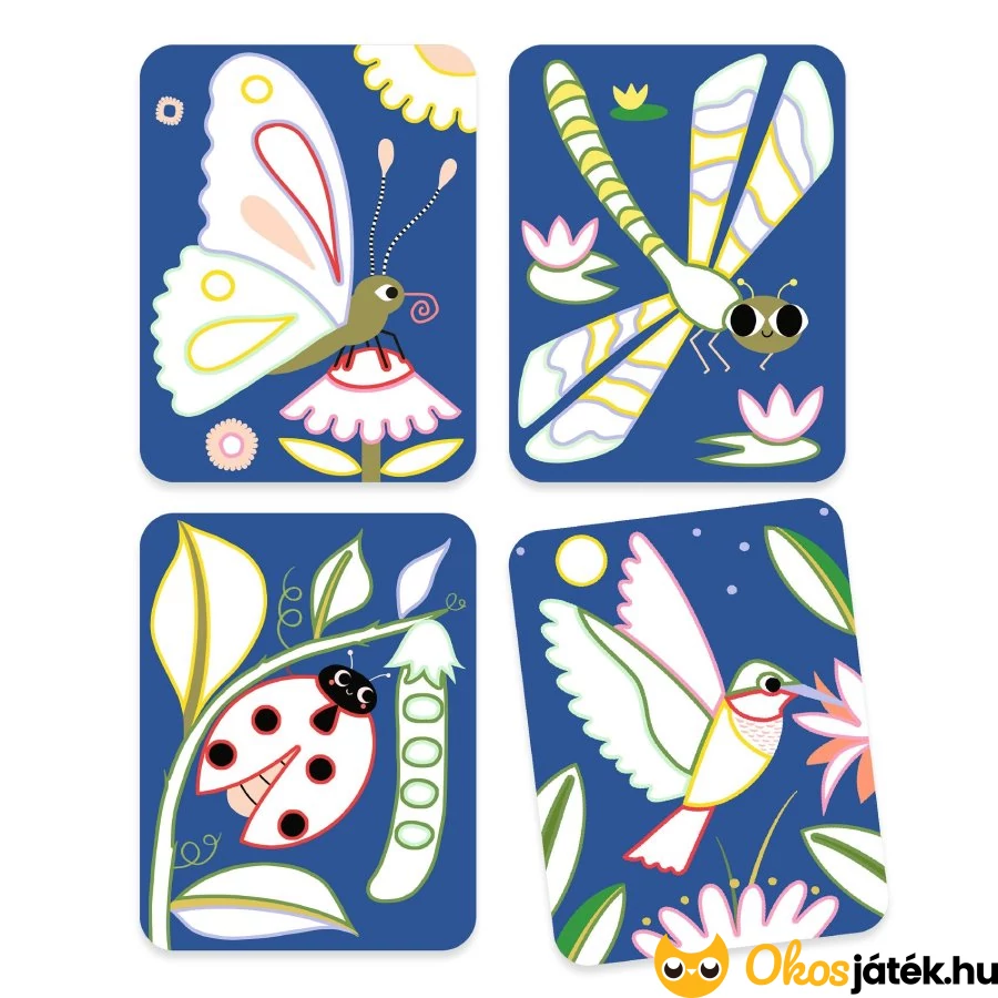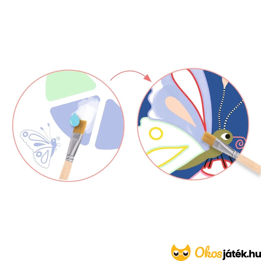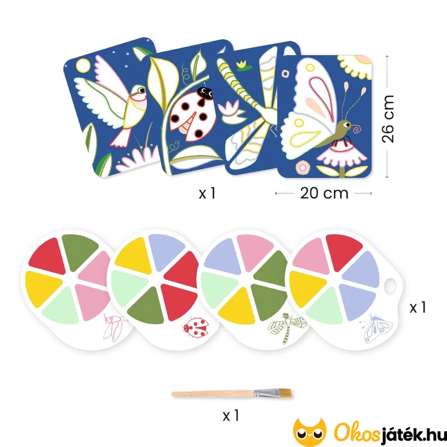 A kifesthető képek 4 kedves állatot ábrázolnak: katicabogár, pillangó, kolibri és szitakötő. Mindegyik képhez tartozik egy-egy festékpaletta is, mely nem kimondottan paletta, hiszen a festéshez szükséges színek egy-egy lapon találhatók. Ezeken az állatok miniatűr képei is rajta vannak, így a gyerekek is látni fogják, hogy melyik képhez tartoznak az adott színek.