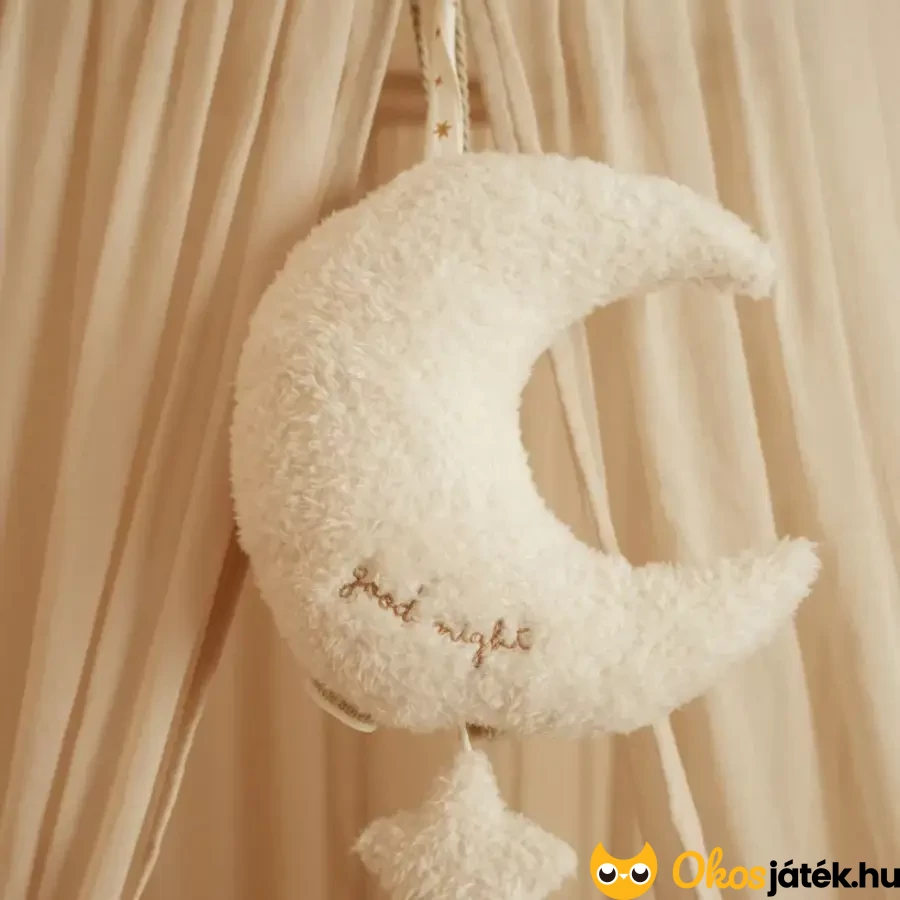 Felhúzható zenélő hold a Little Dutchtól, mely egy bájos, puha plüss kiegészítő. Nemcsak dekoratív eleme a babaszobának, hanem nyugtató hatásával és dallamával segíti a kicsik pihentető elalvását is.