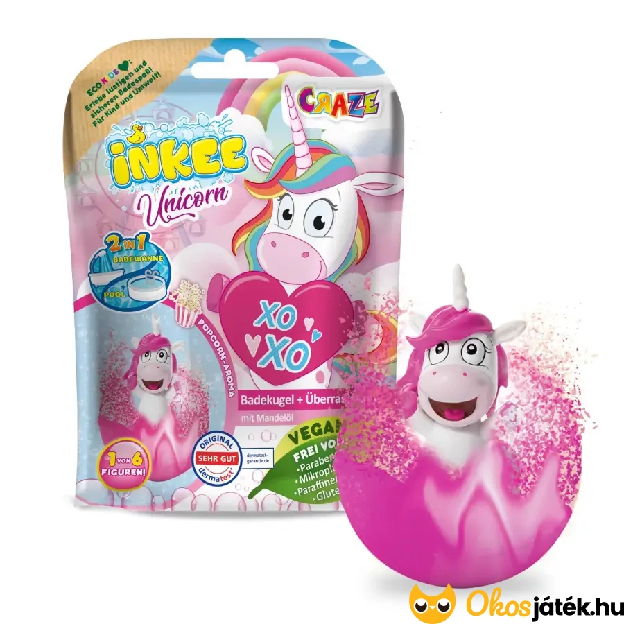 A Craze Inkee fürdőgolyó meglepetés unikornis figurával színessé varázsolhatja a vizet, ezáltal szórakoztatóvá a fürdésidőt. A Vegan fürdőbomba egy kedves meglepetést, egy gyűjthető unikornis figurát is rejt magában.