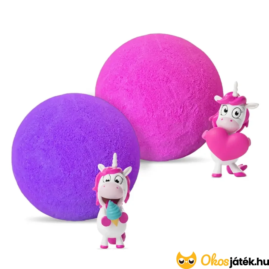 A fürdőgolyó rózsaszín vagy lila színben kapható, melyet meglepetésszerűen tartalmaz a készlet. A fürdőbombában található unikornis a 6 különböző figura egyikét tartalmazza, melyeket a csomagolás hátulja is mutat.