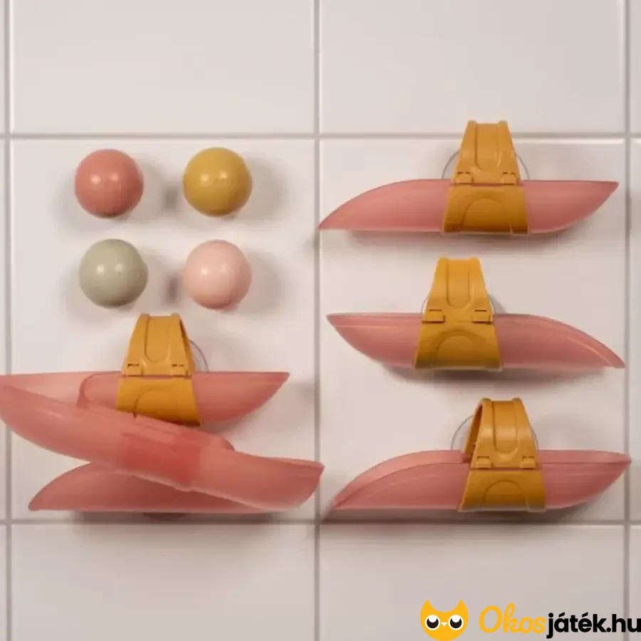 A készlet 4 különböző elemből áll, melyek könnyedén felhelyezhetők a tapadókorongoknak köszönthetően. Tökéletesen illeszkedik fali csempére, fürdőkád oldalára, vagy zuhanyfal csempéjére egyeránt. A 3 egyenes és 1 kanyargós elemnek köszönhetően a gyerekek saját vízi pályát építhetnek, majd elindíthatják a 4 darab színes golyót, melyet a készlet tartalmaz.