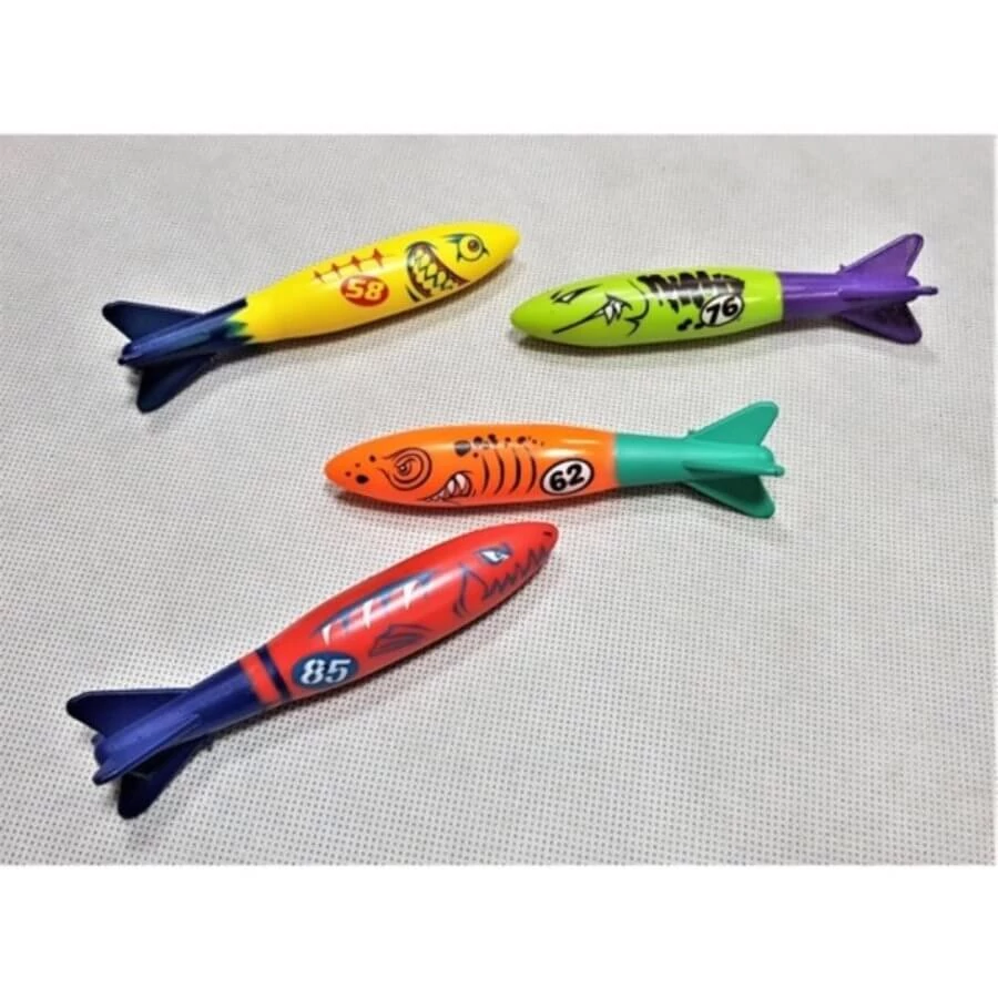 Merülő medencejáték, melynek 4 darab torpedója lesüllyed a medence fenekére, hogy a gyerekek lemerülhessenek és felhozhassák őket.