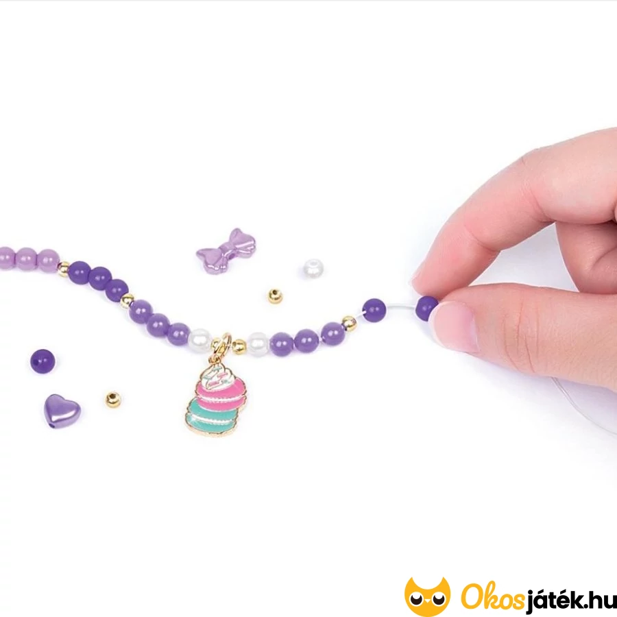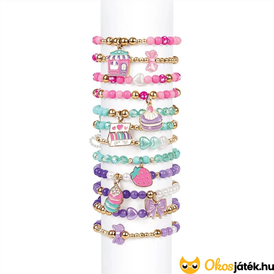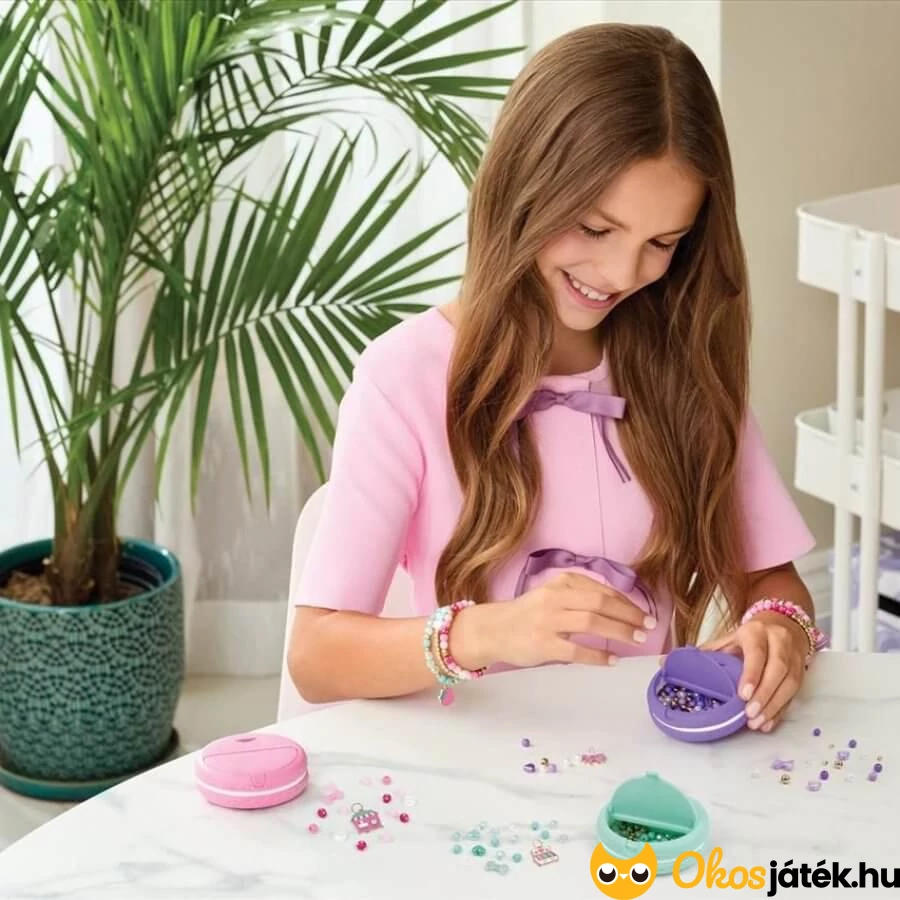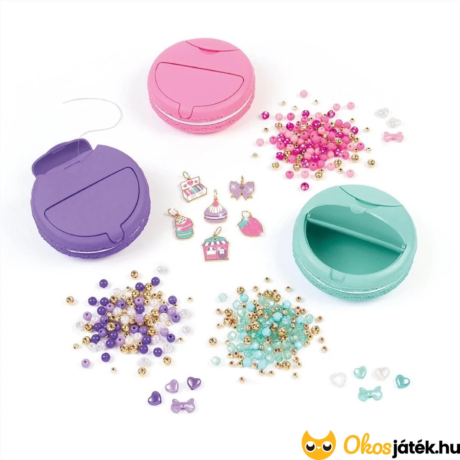Ötletes gyöngyfűző, ékszerkészítő játék, melyben a gyöngyök macaron tartóban érkeznek, melyekből akár 12 karkötő is készíthető.