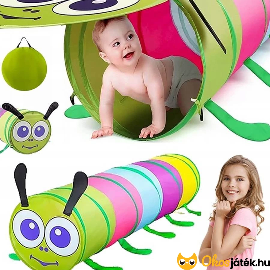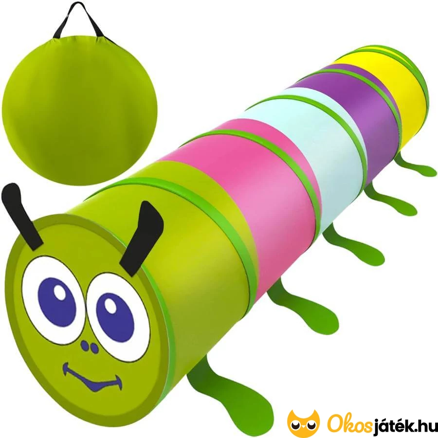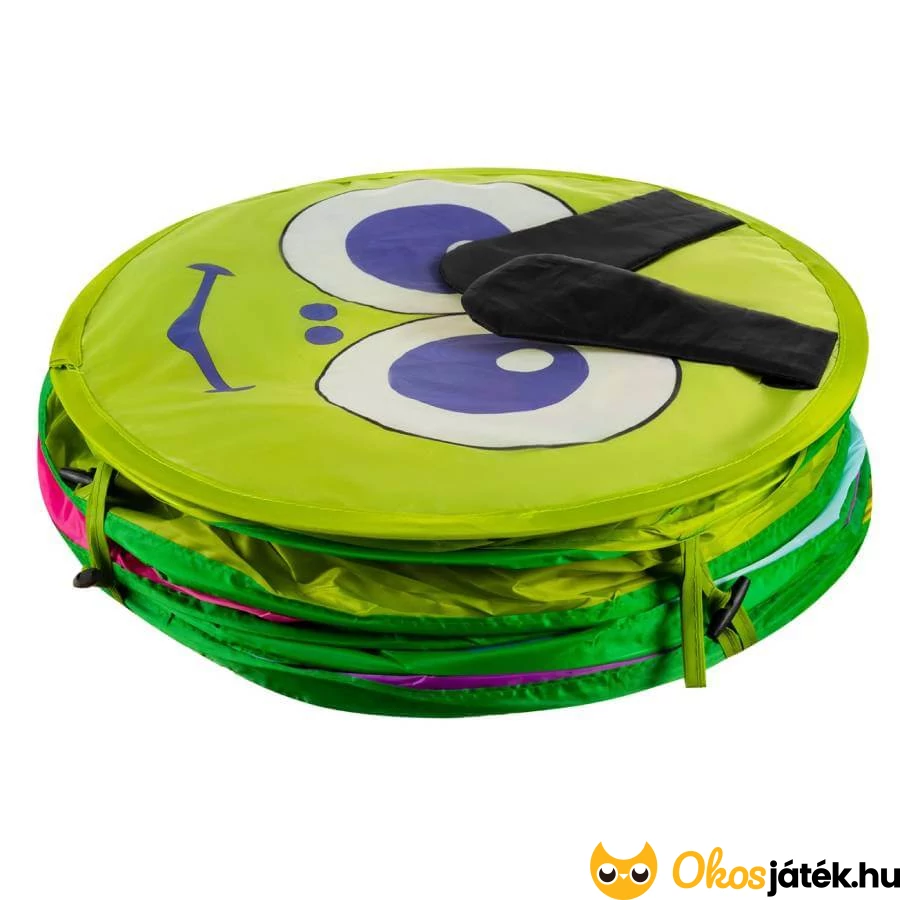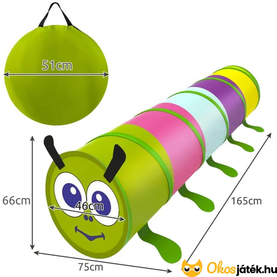A 180 cm hosszú és 46 cm átmérőjű színes játék alagút egy pillanat alatt összecsukható, és egy vékony kis füles tárolóban hordozható.