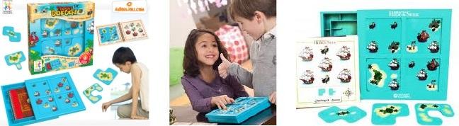 A kisebb gyermekeknek a Hide&Seek, Kalózrejtő játékát javaslom, amely nem sokban tér el a szafaris változattól. Ebben az esetben is 4 nehézségi szint biztosítja, hogy sokáig a gyermekek kedvence maradjon a játék. A doboz tartalma szintén egy játéktábla, négy takarólap és egy feladványfüzet. Itt a kalózokat, a hajókat és a kincseket kell elrejteni és felfedni, s természetesen itt is úgy kell elhelyezni a takarólapokat a táblán, hogy csak a megadott figurákat lehessen látni.