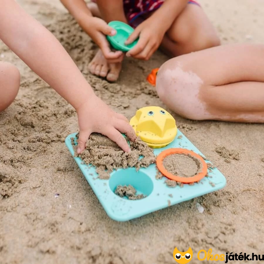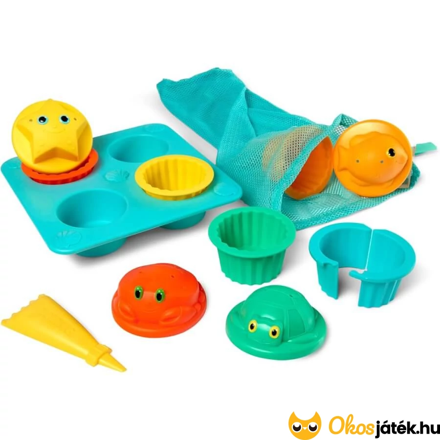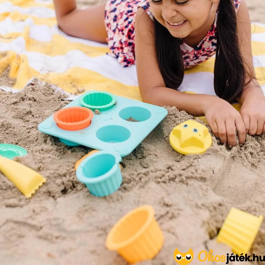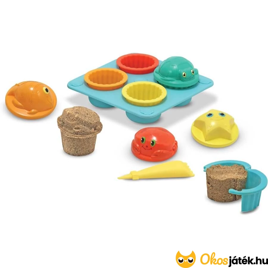 A készlet különféle muffin formákat tartalmaz, amiket könnyedén megtölthetnek homokkal a gyerekek, hogy elérjék a tökéletes sütiformát.