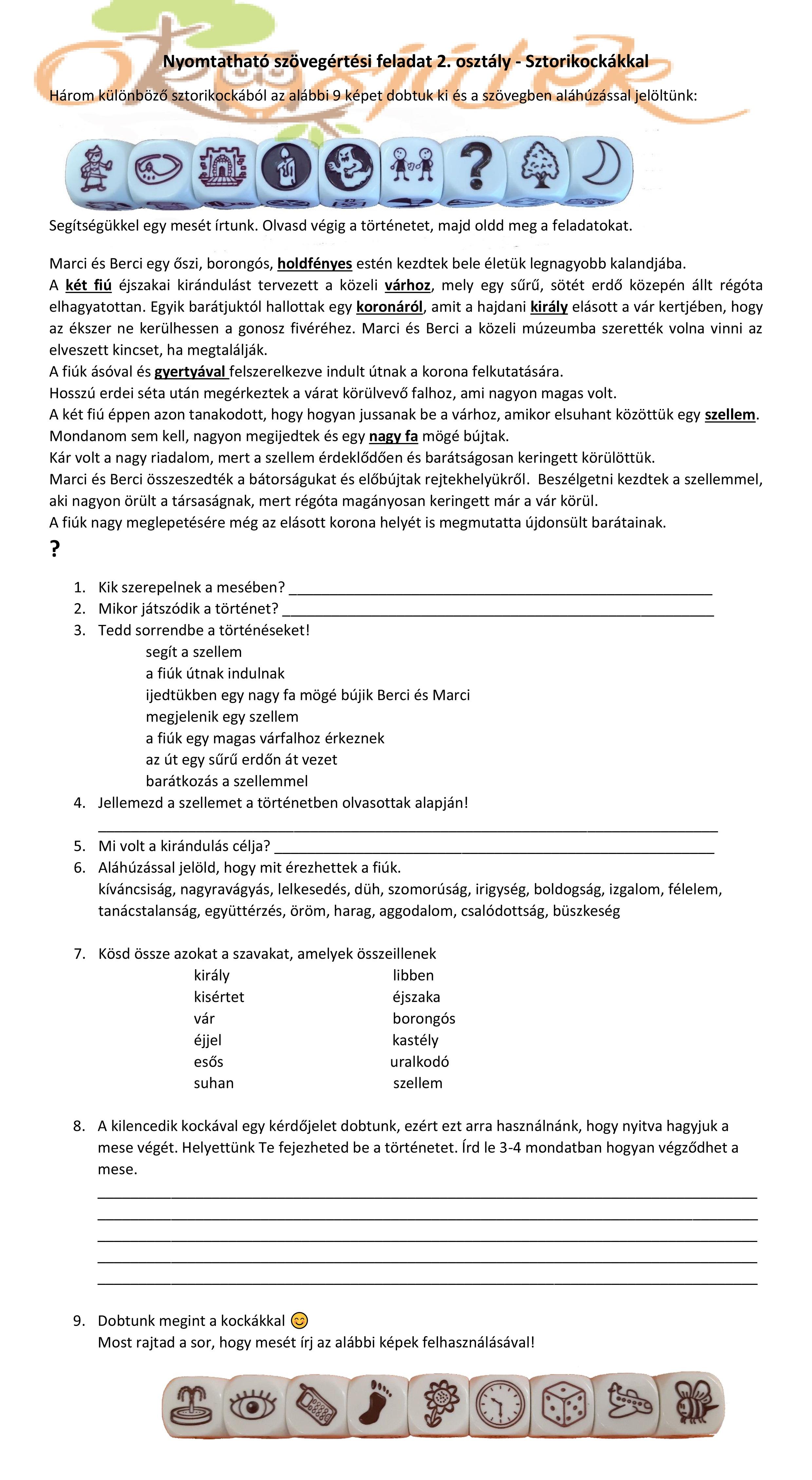 A szövegértés feladat a sztorikocka segítségével készült. Lejjebb megtalálod a különböző kiadásokat.