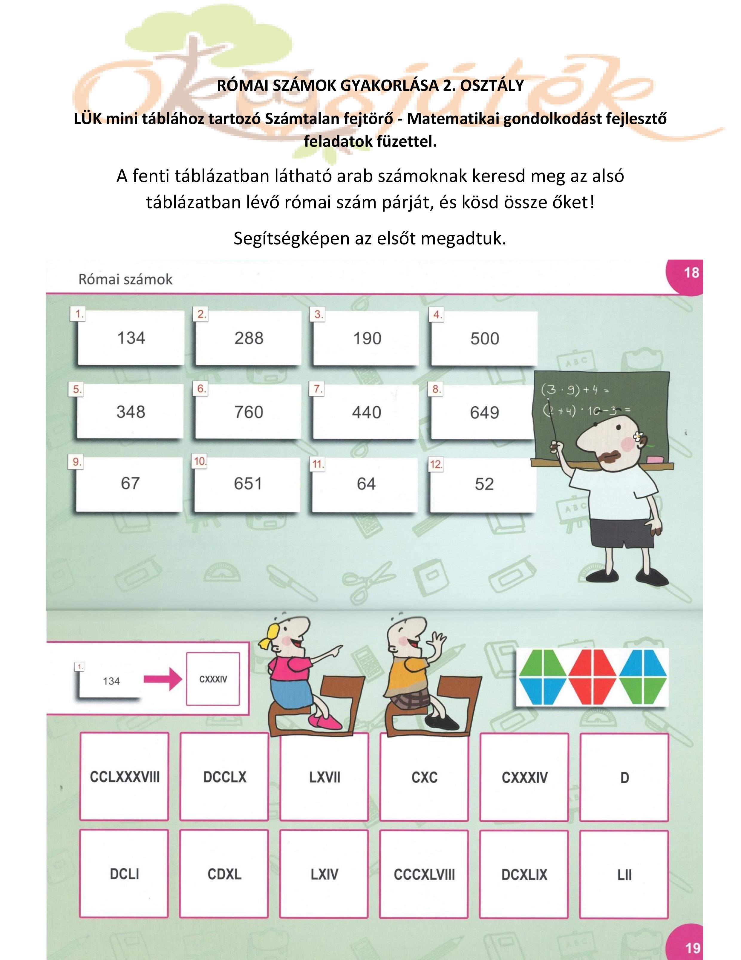 A római számok gyakorlásához feladatot a MiniLÜK táblához tartozó Számtalan fejtörő - Matematikai gondolkodást fejlesztő feladatok füzetből vettük.