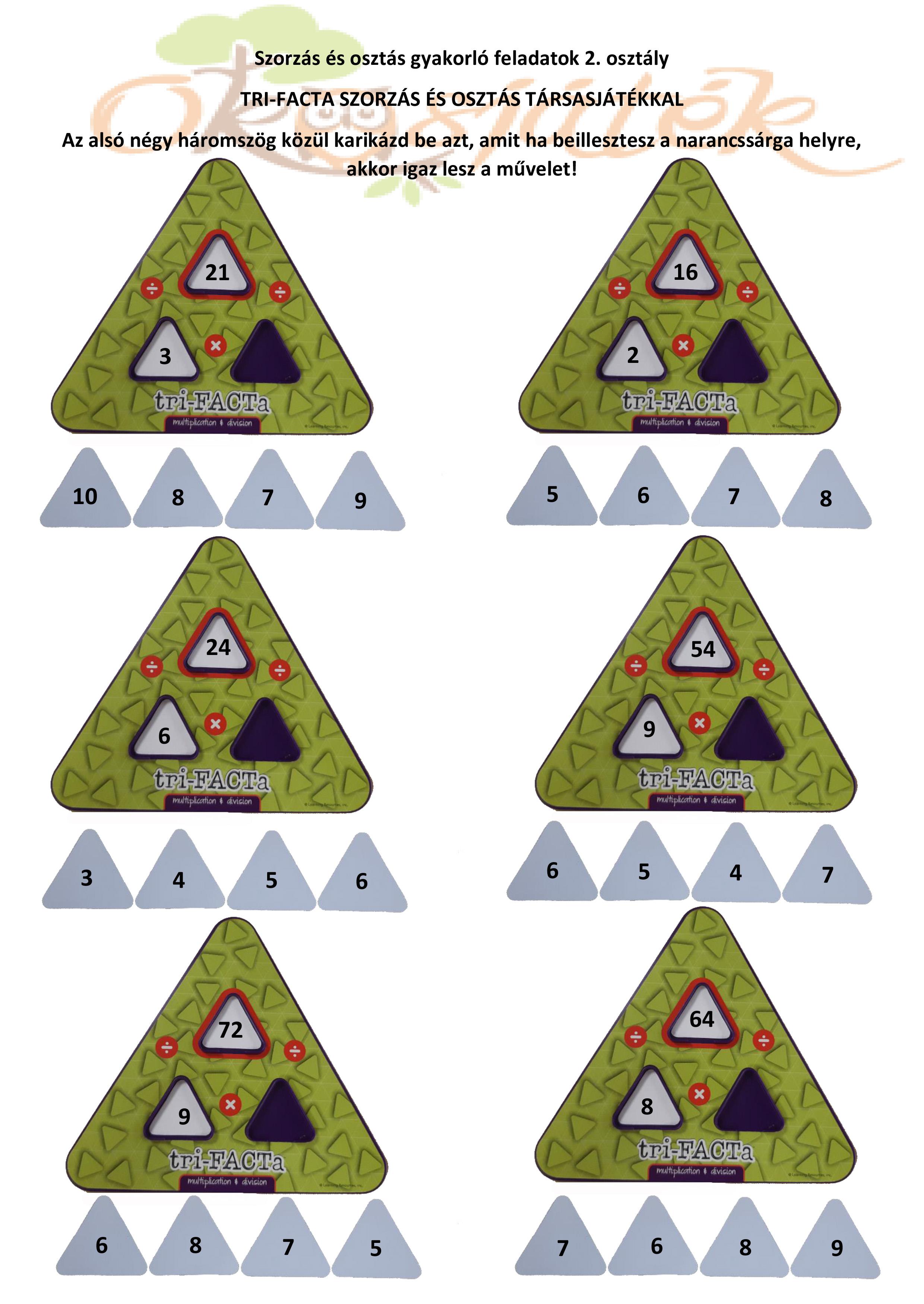 A szorzás, osztás gyakorlásához a Tri-Facta szorzás-osztás gyakorló társasjáték segítségével készítettünk nektek nyomtatható feladatokat.