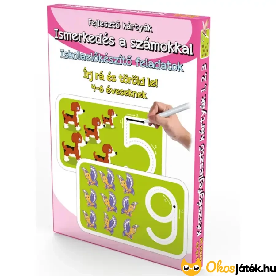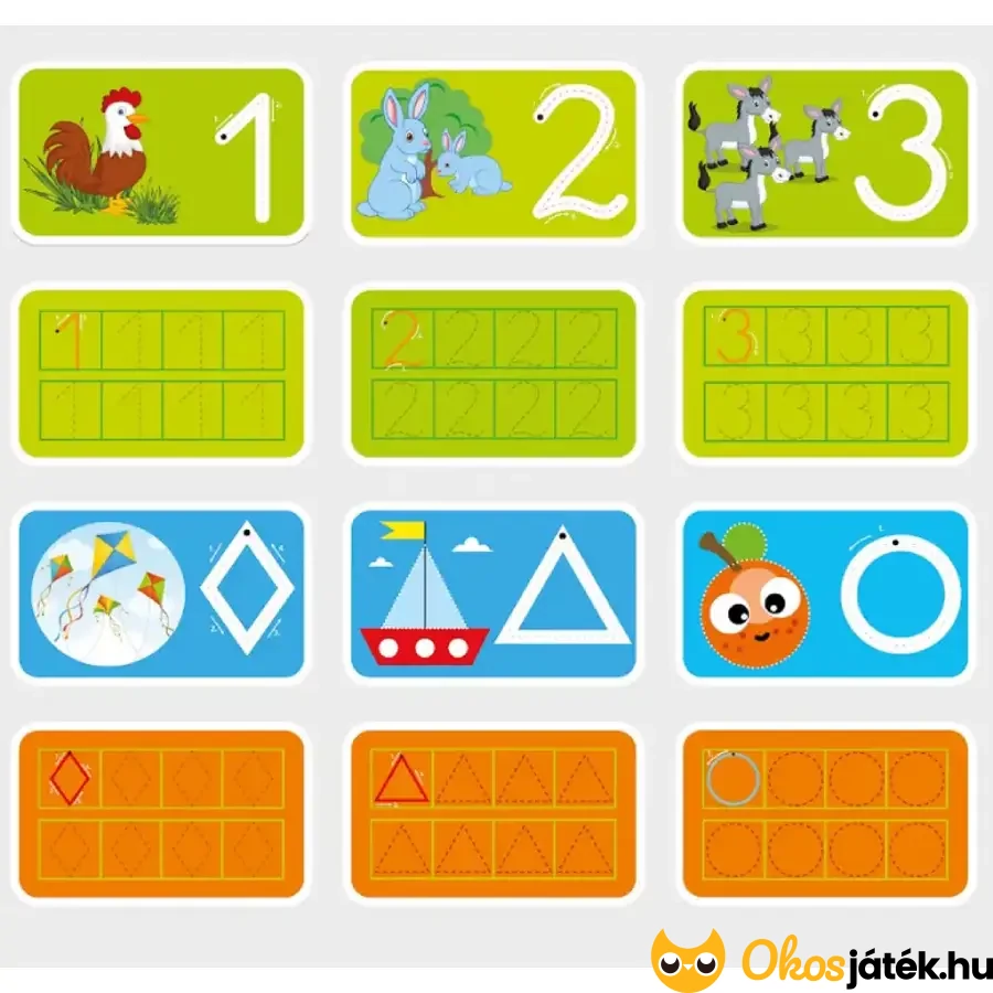 Oktató jelleírást gyakoroltató fejlesztőjáték 40 oldalnyi feladattal. Kreatív ösztönző játék a számok és mennyiségek összekapcsolásához, az arab számokat alkotó vonalak gyakorlásához.
