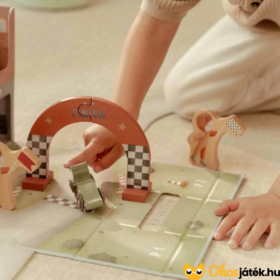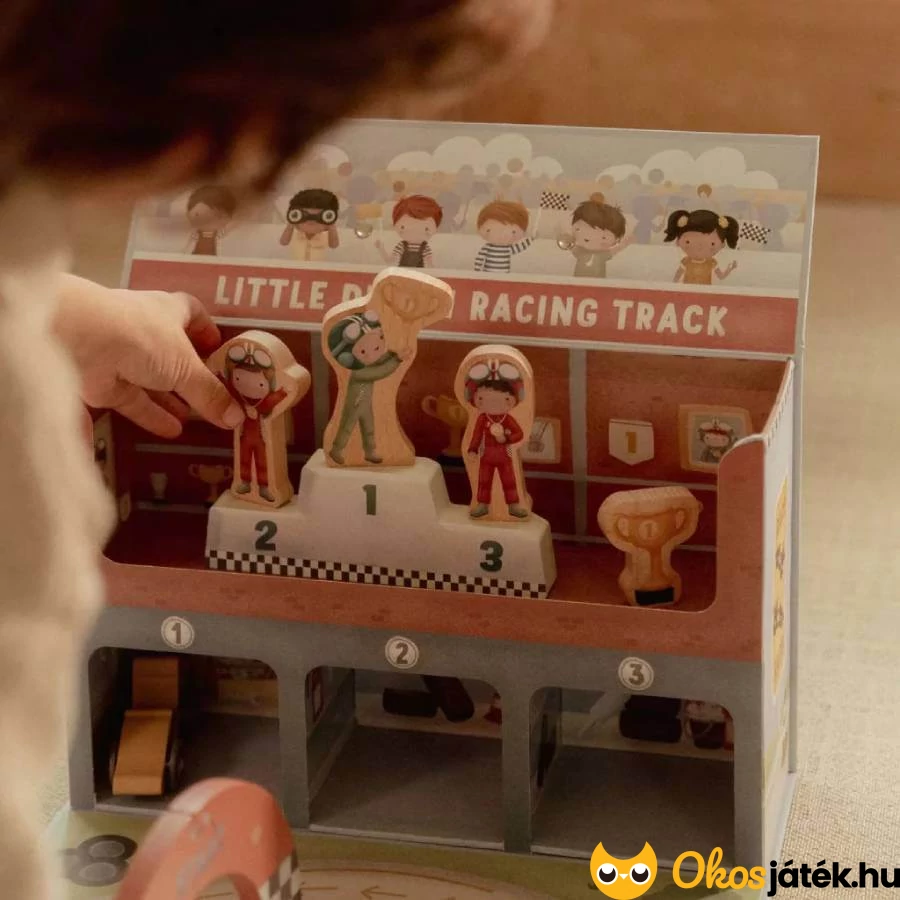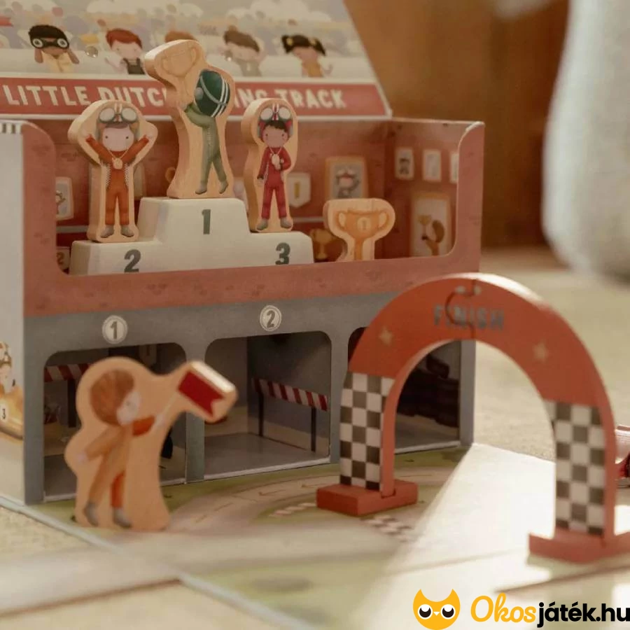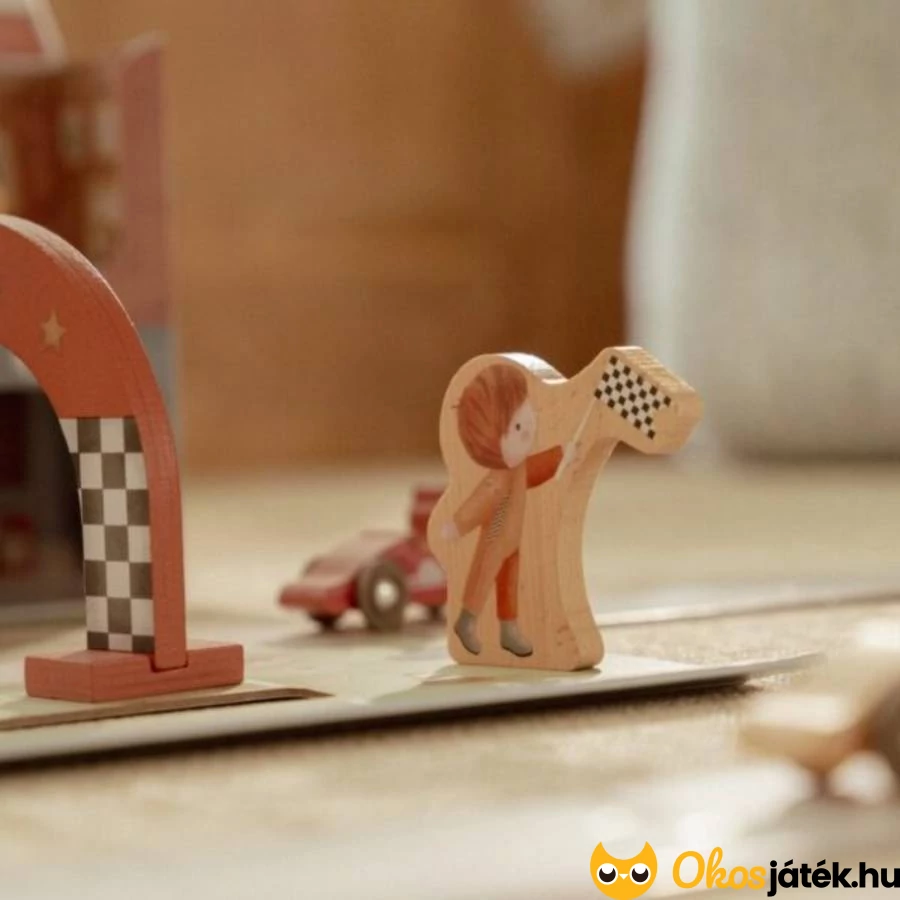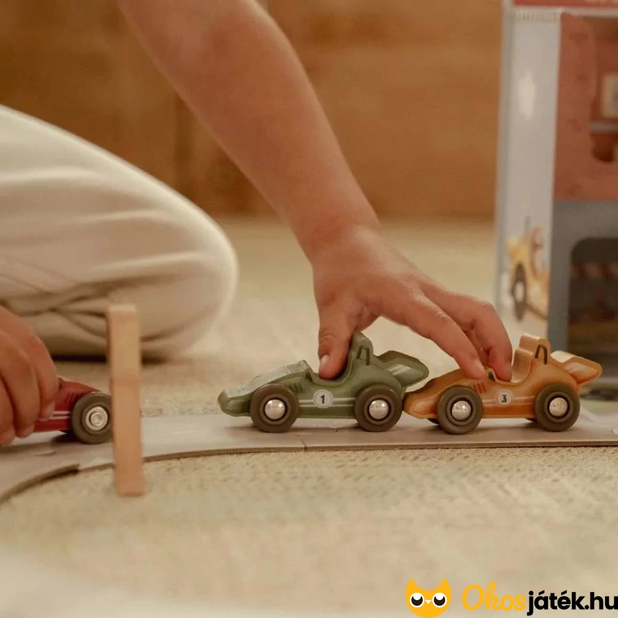 A játék doboza egy pillanat alatt kinyitható, és a gyerekek egy jó minőségű, kartonból készült versenypályát varázsolhatnak maguk elé. A pályát puzzle-szerűen lehet összeállítani, és a doboz maga lesz a szerelőműhely. A készletben versenyautó, pilóta, dobogó és közlekedési táblák találhatók. Az autók guríthatóak.
