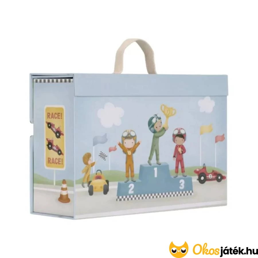 Az autókat kedvelő fiúknak tökéletes ajándék ez a hordozható versenyautós játékkoffer.
