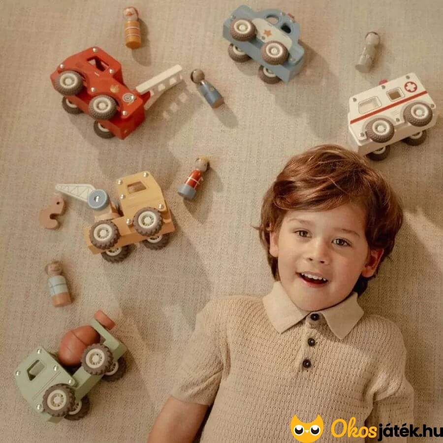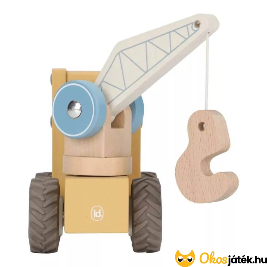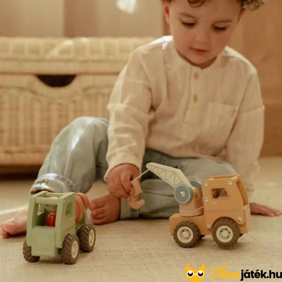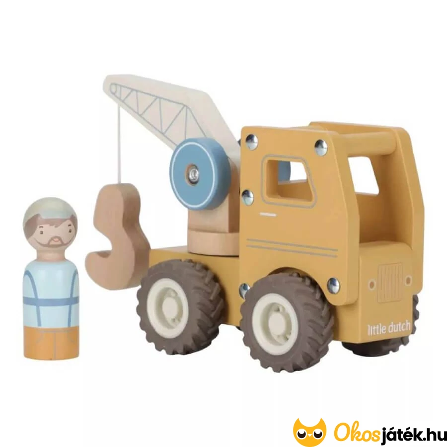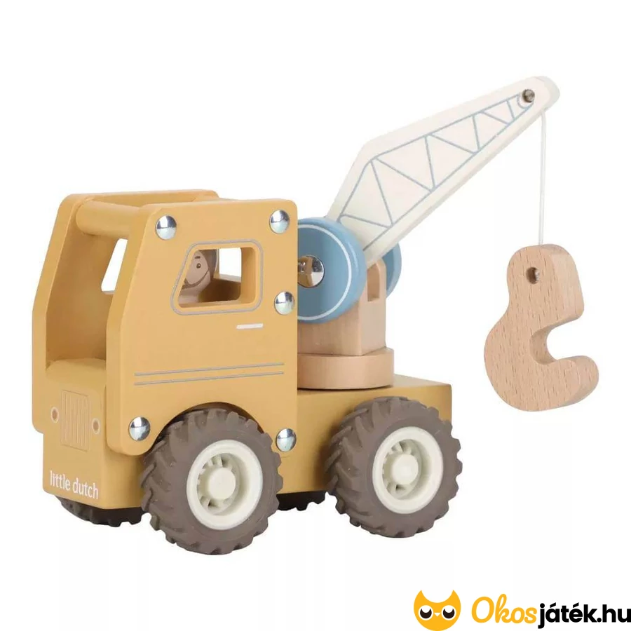 A gyerekek rakományokat mozgathatnak a Little Dutch fából készült darus autójával. A daruskocsi emelőkarja mozgatható, így a gyerekek könnyedén felemelhetik és a helyükre tehetik a szállítmányokat, miközben saját történeteket és kalandokat találnak ki.