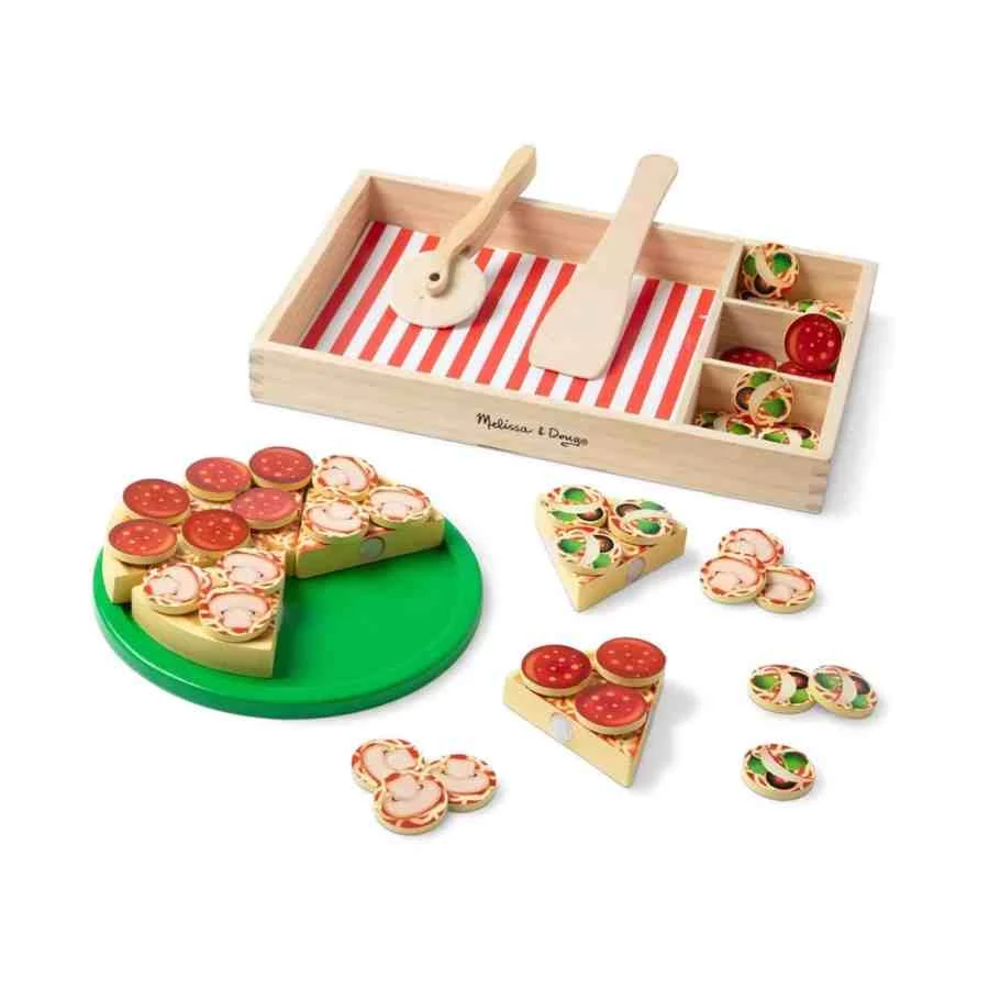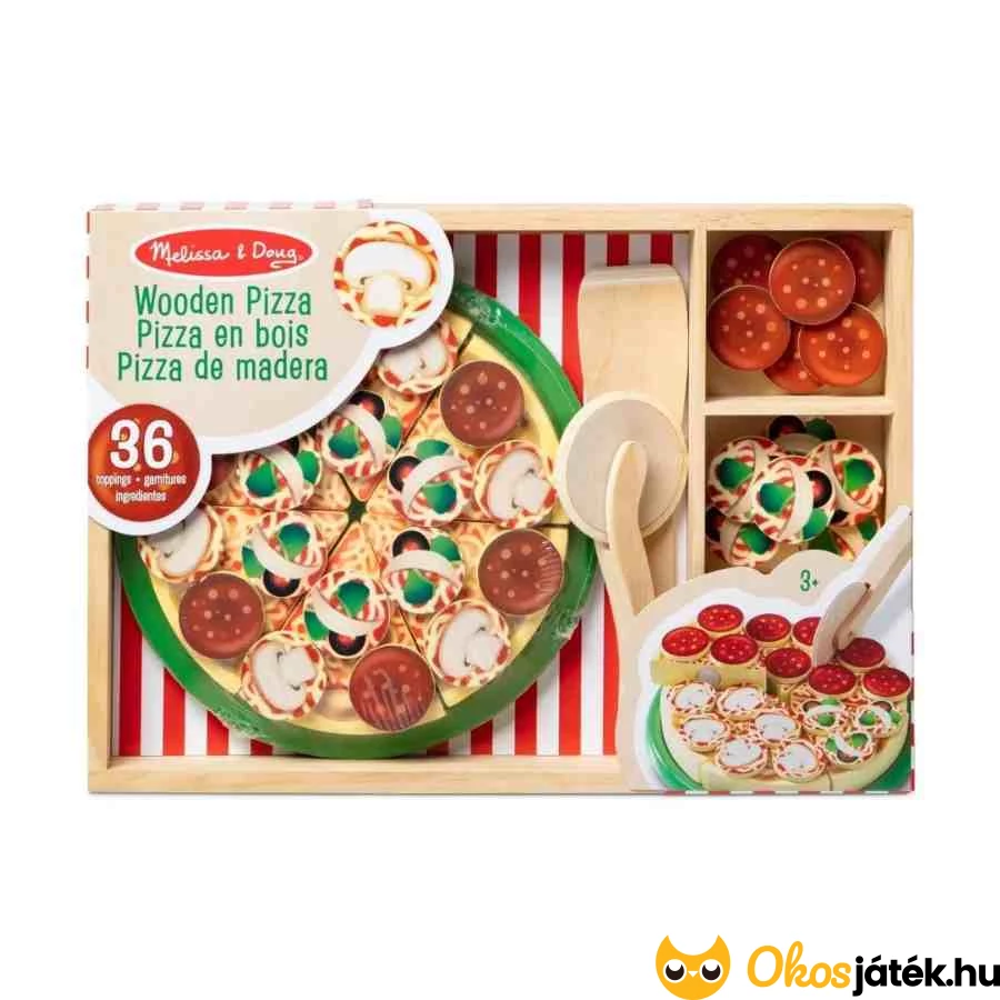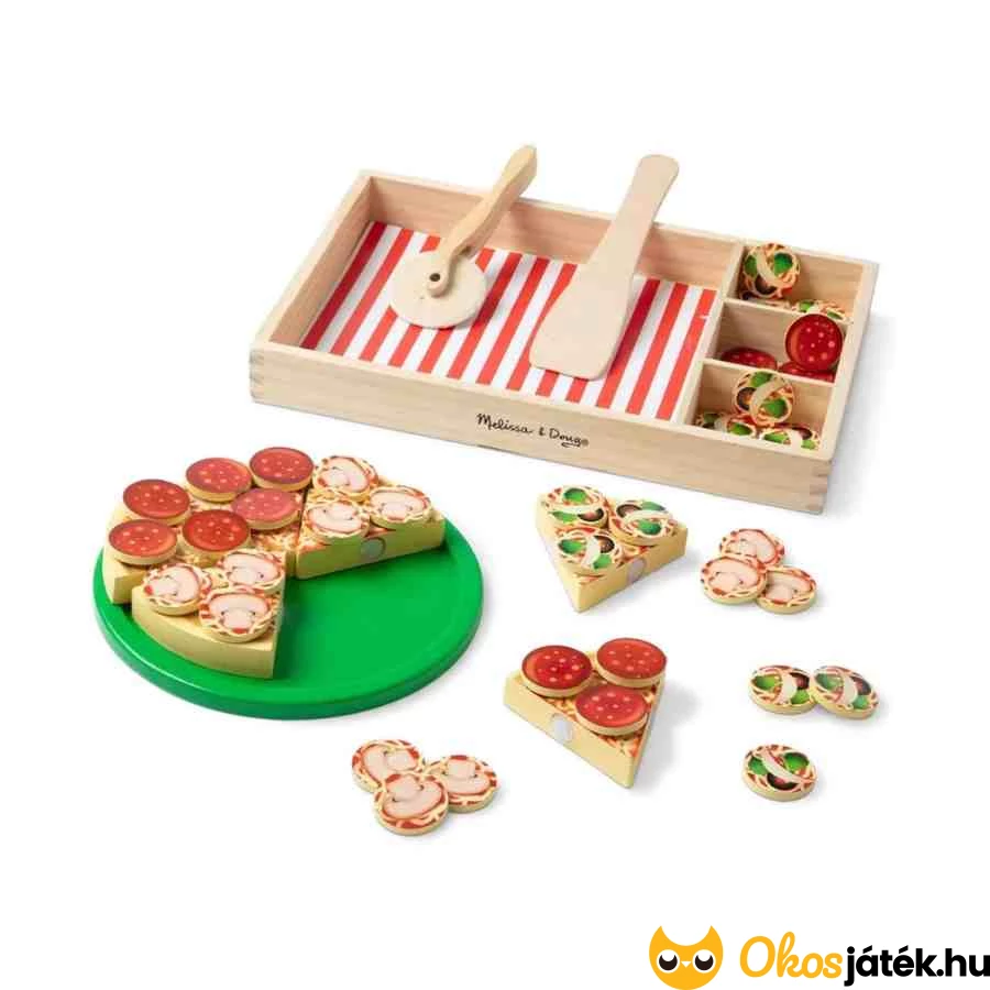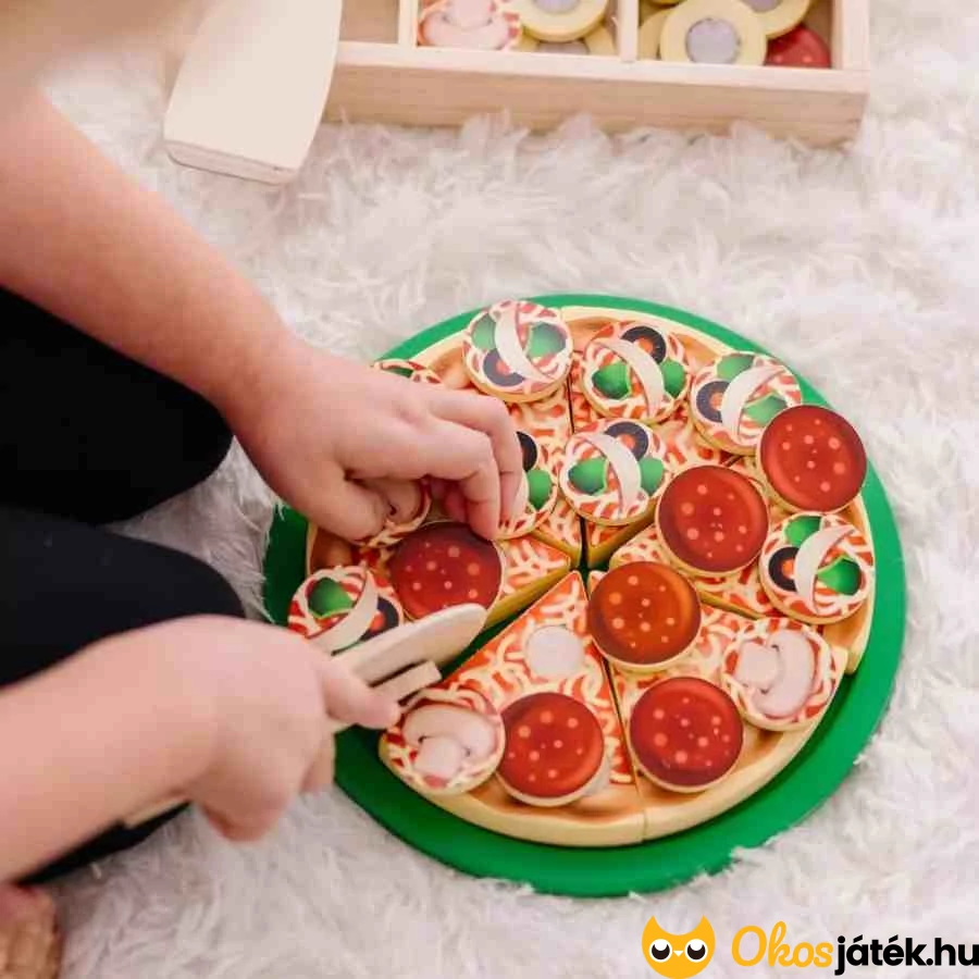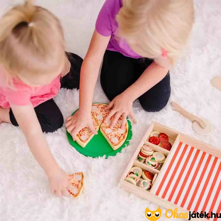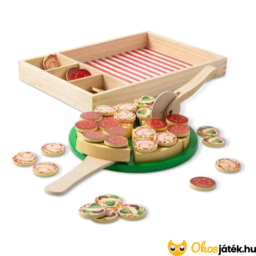 A fából készült pizza hat szeletre vágható, a feltétek pedig tépőzárral rögzíthetők (pl. gomba, pepperoni, olívabogyó, paprika). A szeletek a pizzalapáttal egyszerűen tálcára helyezhetők, játék után pedig minden elem könnyen elpakolható a praktikus fa tárolódobozba.