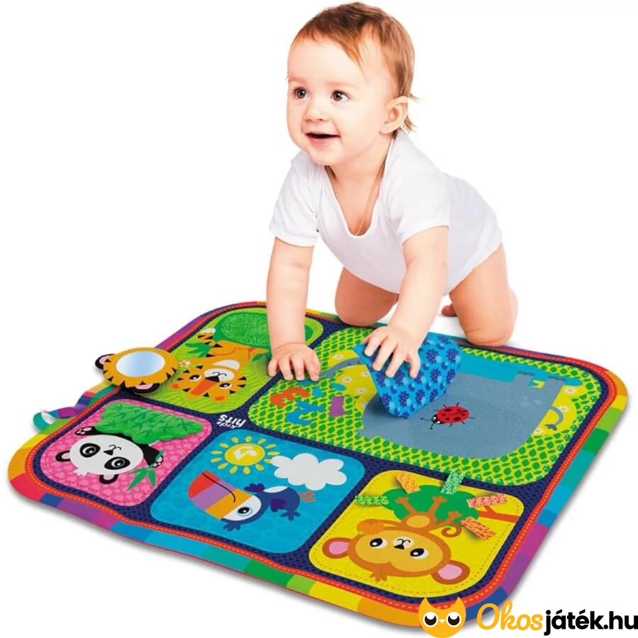 Aranyos, puha anyagú, állatos játszószőnyeg kimondottan a legkisebbeknek már 3 hónapos kortól. Számos felvedeznivaló várja a kicsiket, különböző textúrák, csörgő és zizegő elemek, színek, minták, megragadható címkék és egy biztonságos tükör is.