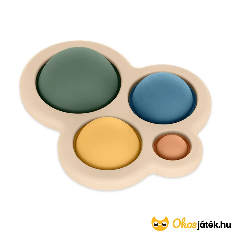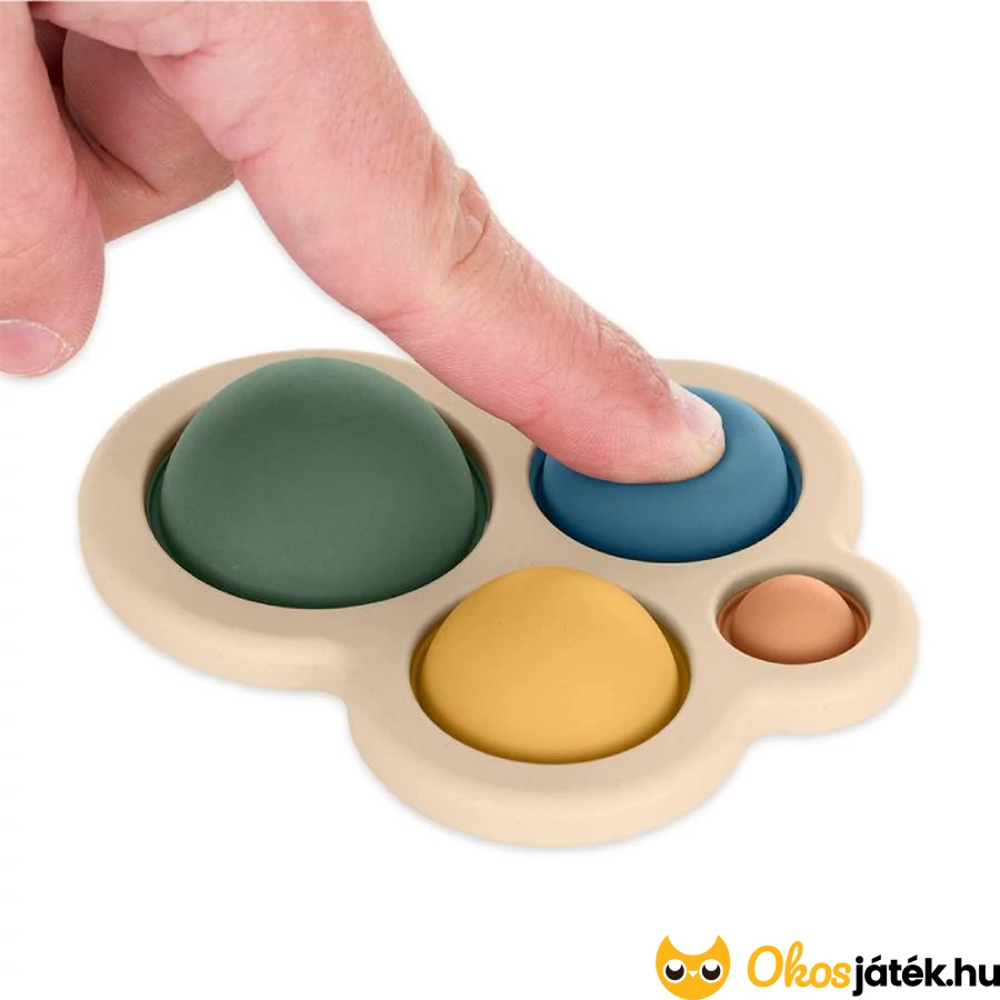 A játék különböző méretű, puha buborékjai nyomkodhatóak, így a gyermek finommotorikus készségei játék közben természetes módon fejlődnek. A gombok lenyomása nemcsak szórakoztató, hanem segít az ujjak ügyesítésében és a kéz koordinációjának kialakításában is.