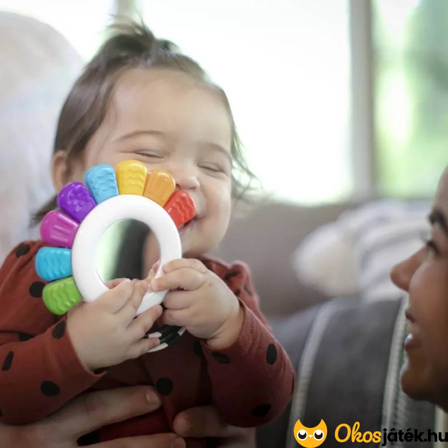A játék élénk színekkel és változatos textúrákkal stimulálja a baba látását és tapintását, a beépített csörgő finom hangjai pedig segítik a hallás fejlődését és lekötik a figyelmet.