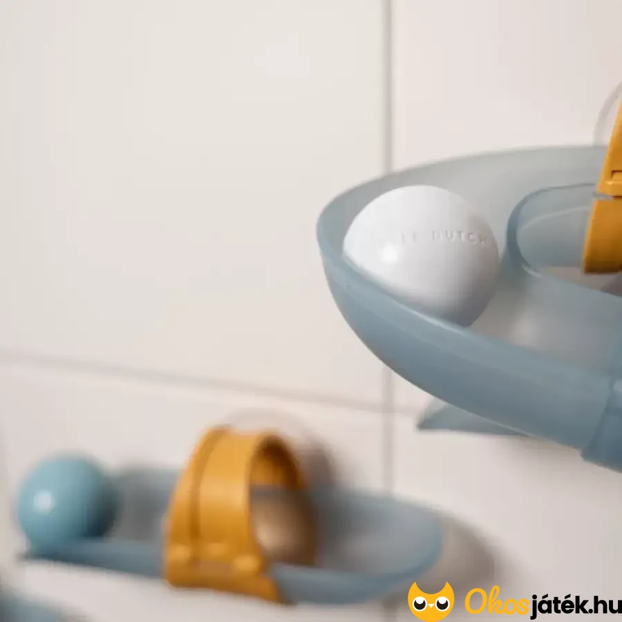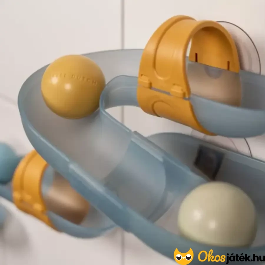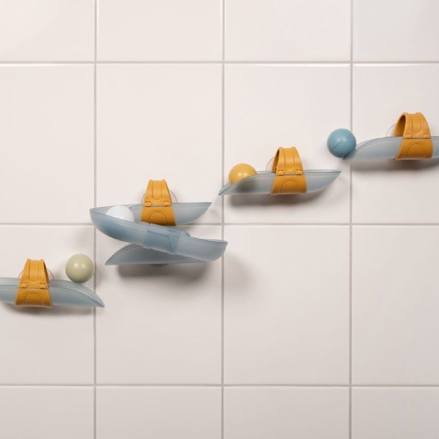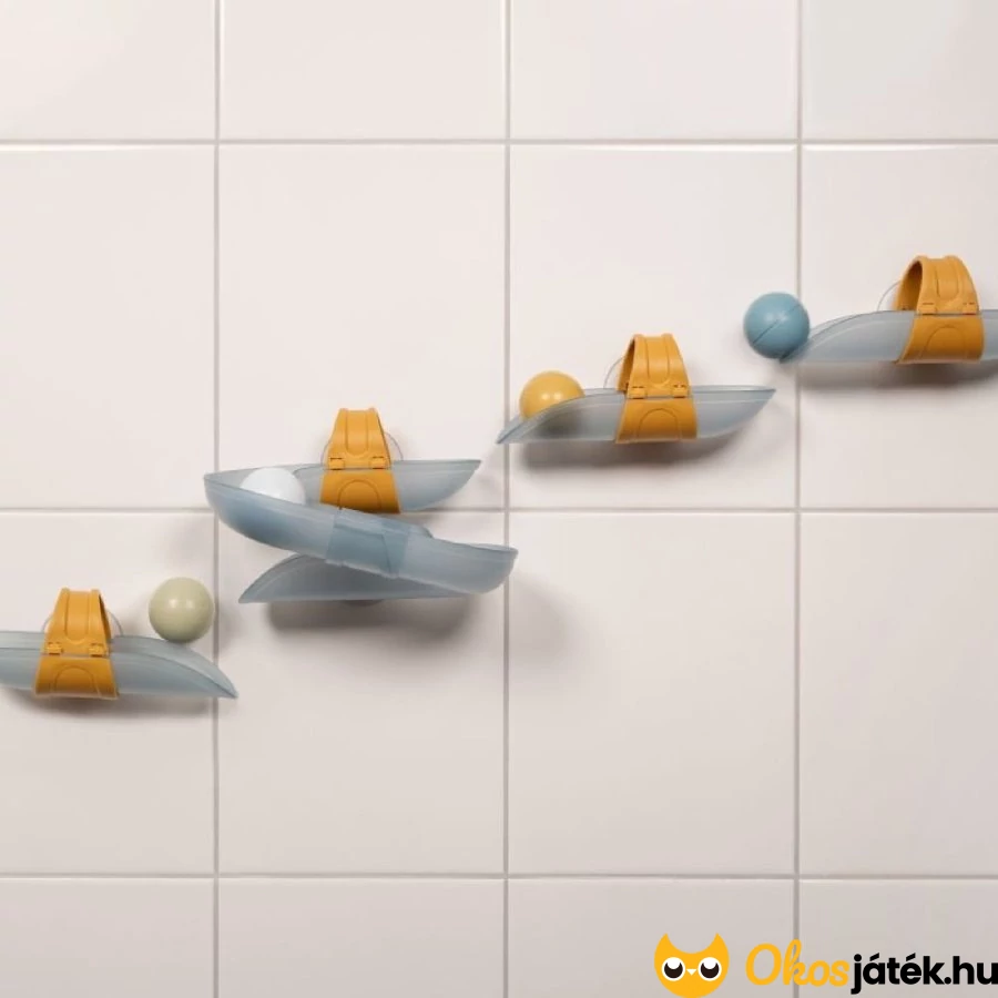 A szett négy kék pályaelemet tartalmaz, melyek tapadókorongokkal rögzíthetők a fürdőszoba falára vagy csempéjére. A gyerekek saját golyópályát építhetnek, melyen a készletben található 4 különböző színű labda kacskaringózva legurulhat, majd csobbanva a vízbe érkezhet.