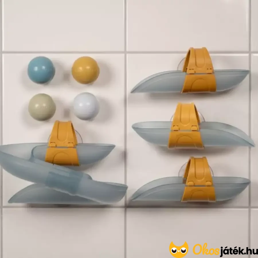 A tapadókorongos elemeket egyszerű felhelyezni a csempére, vagy akár a kád falára. Igazi kihívást nyújt a gyerekeknek, mivel a különböző elemeket úgy kell felhelyezni, hogy a golyók akadálytalanul végig tudjanak haladni a pályán. A golyók gurulási idejét meggyorsíthatják a gyerekek, ha vizet öntenek a pályára.