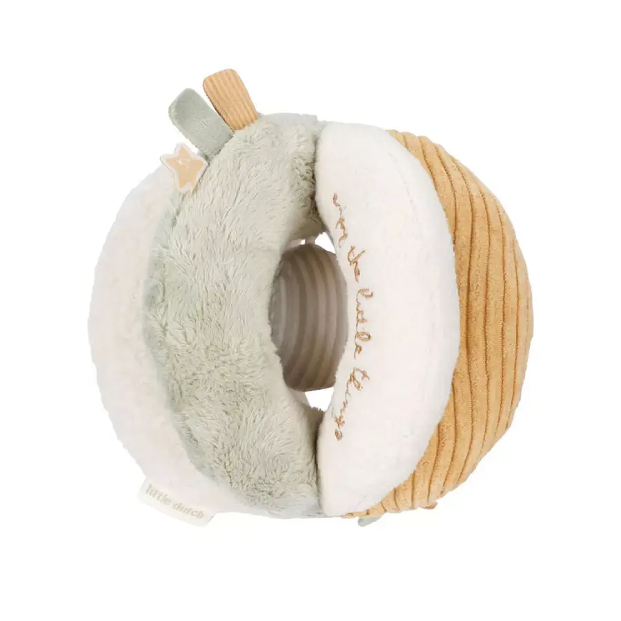 Puha anyagból készült, könnyen megfogható, különböző textúrákkal és csörgőhanggal ellátott plüss labda a Little Dutchtól, így segíti a baba érzékszervi és motoros fejlődését.