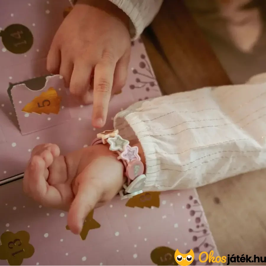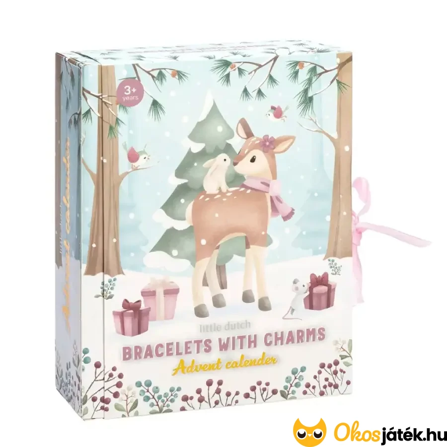 A készletben különböző színű és formájú gyöngyök, bájos medálok és karkötőalapok találhatók – mind-mind a Little Dutch jellegzetes, finom pasztell színeiben és kedves motívumaival. A kalendárium kemény kartondoboz csomagolása elegáns, karácsonyi hangulatú, így kedves ajándék lehet minden kislánynak.