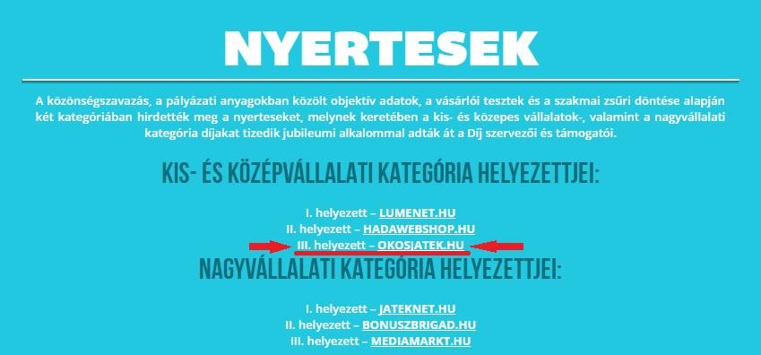 Az Okosjáték Játékbolt a III. helyezést ért el az Év Internetes kereskedője versenyen 2016-ban a KKV szektorban.