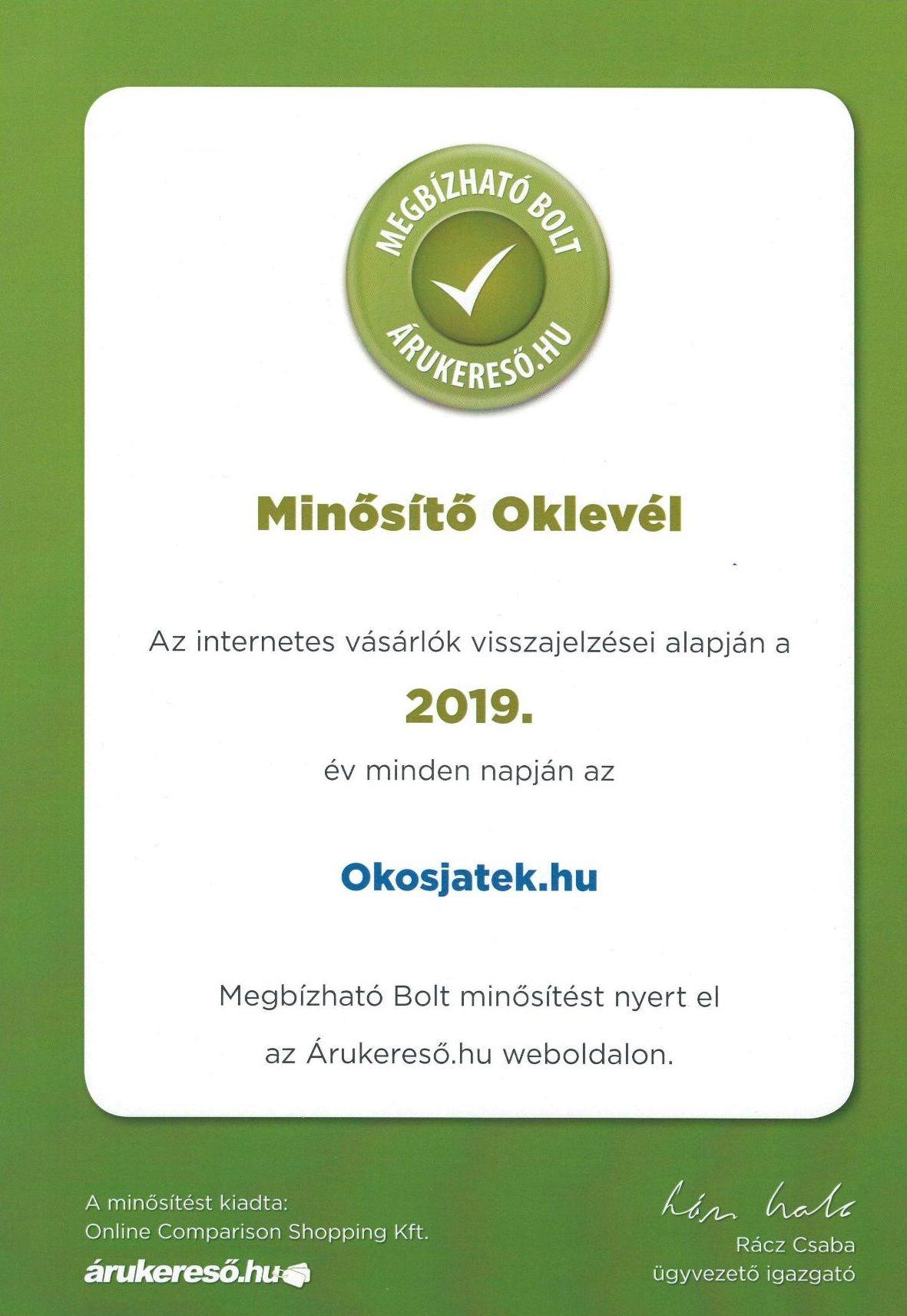 Megbízható bolt minősítést nyert 2019-ben az Okosjáték webáruház