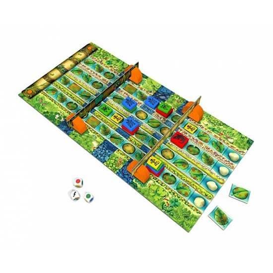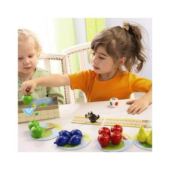 Ez a játék a népszerű Gyümölcsöskert társasjáték legkisebbeknek szóló változata. A játék tartozékai a gyerekek kis kezeihez lettek tervezve. Fejleszti a finom-motorikát, de kötetlen játékra is alkalmas. Beszélgetni lehet játék közben a színekről, a formákról. Dolgozzatok csapatként, próbáljátok összeszedni a gyümölcsöket, mielőtt a holló az út végéhez nem ér.