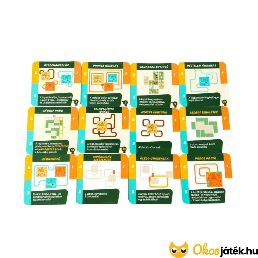 Minden forduló új lehetőségeket tartogat: nyolc útszakaszkártya közül kell körönként kettőt kiválasztani és lehelyezni, majd továbbadni a többit. A bátor vállalkozók hosszú, kockázatos útvonalakat is építhetnek, amelyek ha sikerül lezárni őket, hatalmas pontzáport hoznak. A játék közbeni és játék végi célok teljesítésével további értékes pontok szerezhetők, így minden döntés egy újabb lépés a győzelem felé.