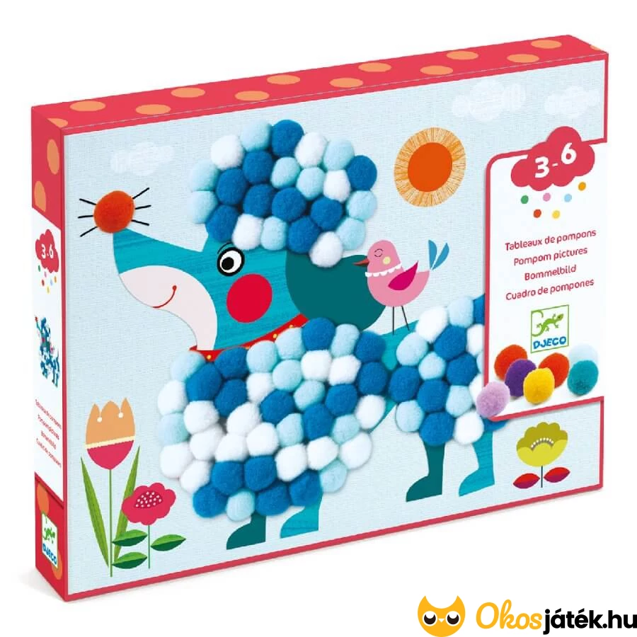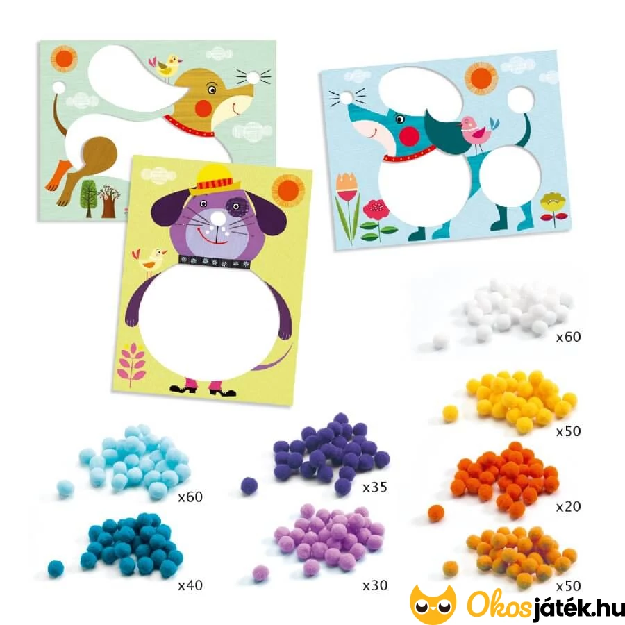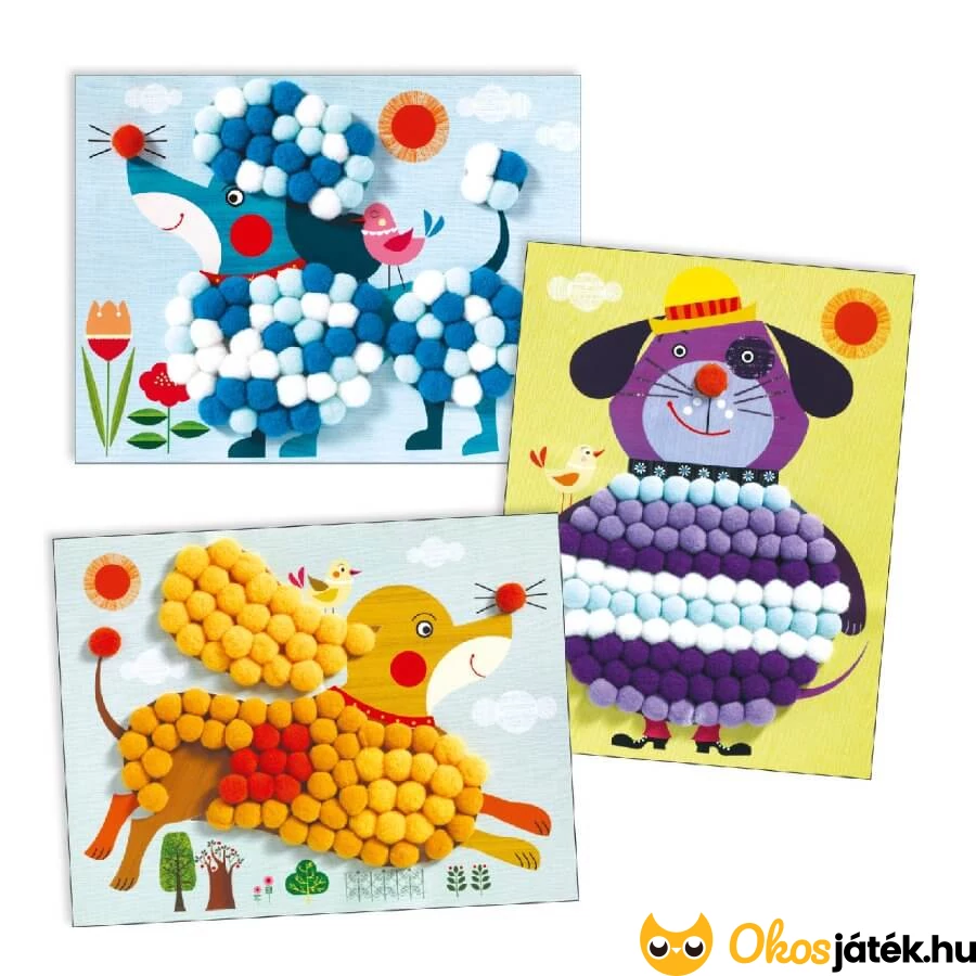 Pomponos kreatív képkészítő aranyos kutyusokkal és sok-sok színe puha pom-pommal a Djeco játékgyártótól már 3 éves kortól. A készlettel három kedves kutyus díszíthető fel egyszerűen, ragasztó használata nélkül.