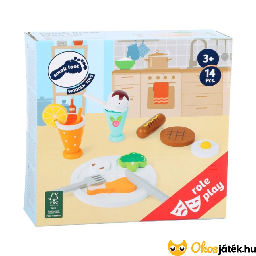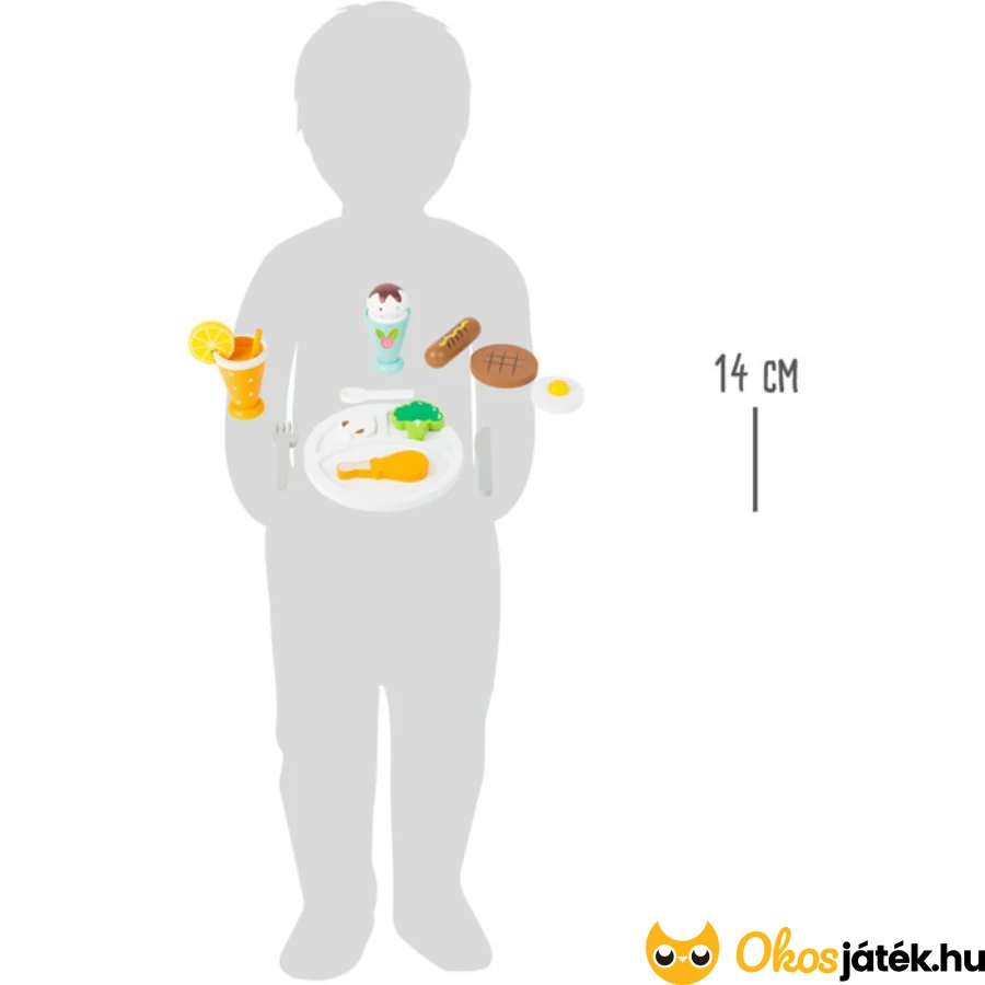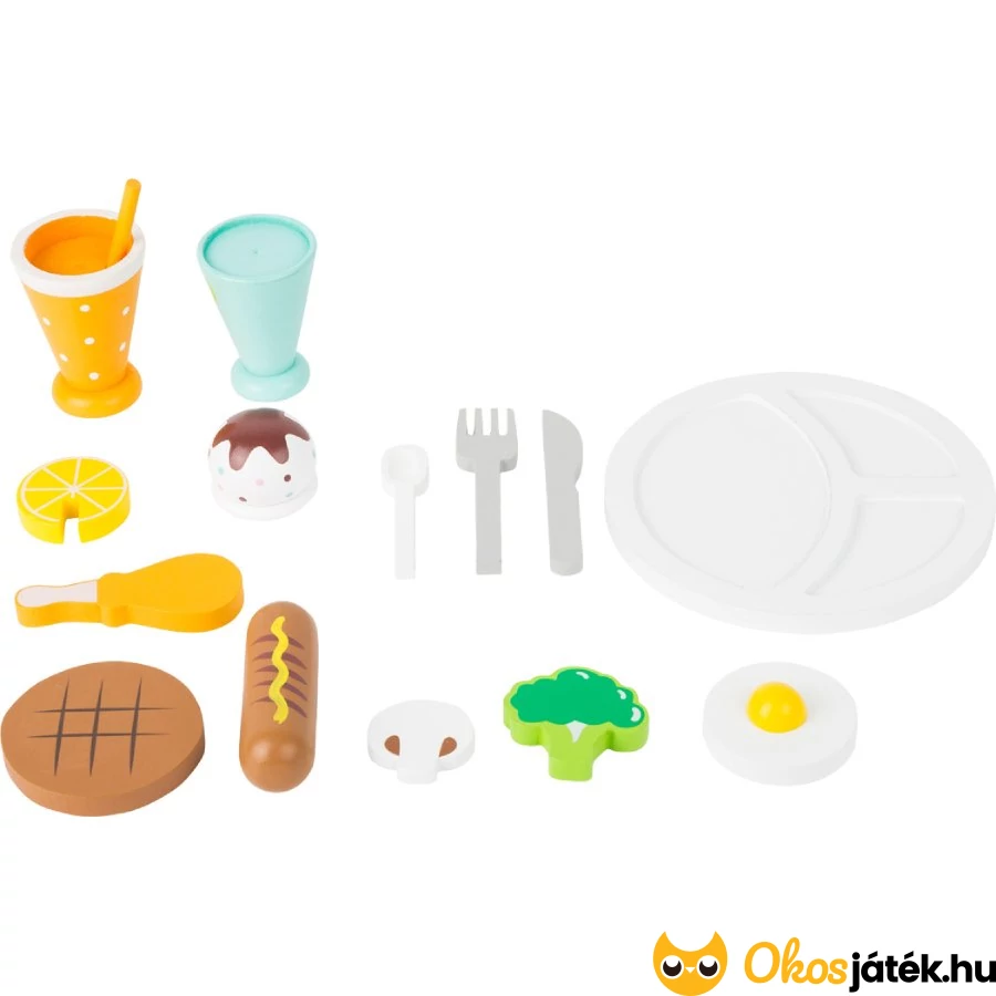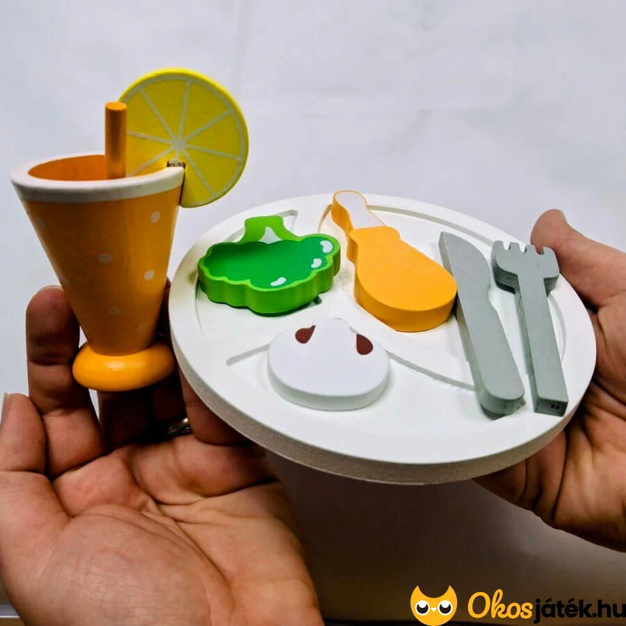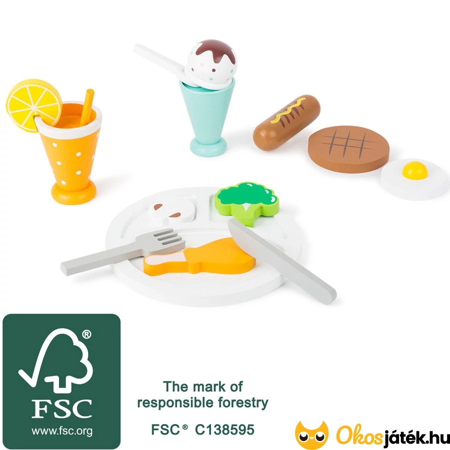 Fa ételeket tartalmazó kisméretű készlet, melyben a tányérra tálalhatja a gyermek a változatos fogásokat, és evőeszközt, italt és fagyit is tehet a tányér mellé a vendégének.