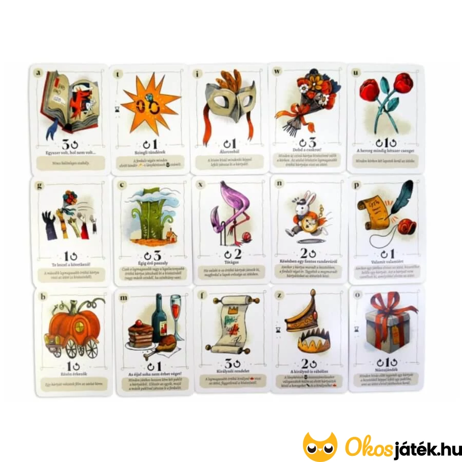 A kártyák 4 színben vannak 1-12-ig megszámozva: királynő, tündér, állat és herceg. A hercegkártyákon vannak a nem kívánt lánykérések (koronás koponyaként ábrázolva a lapokon), de az állatkártya 8-as értékén a róka helyett béka van, ami 5 lánykérést ér.