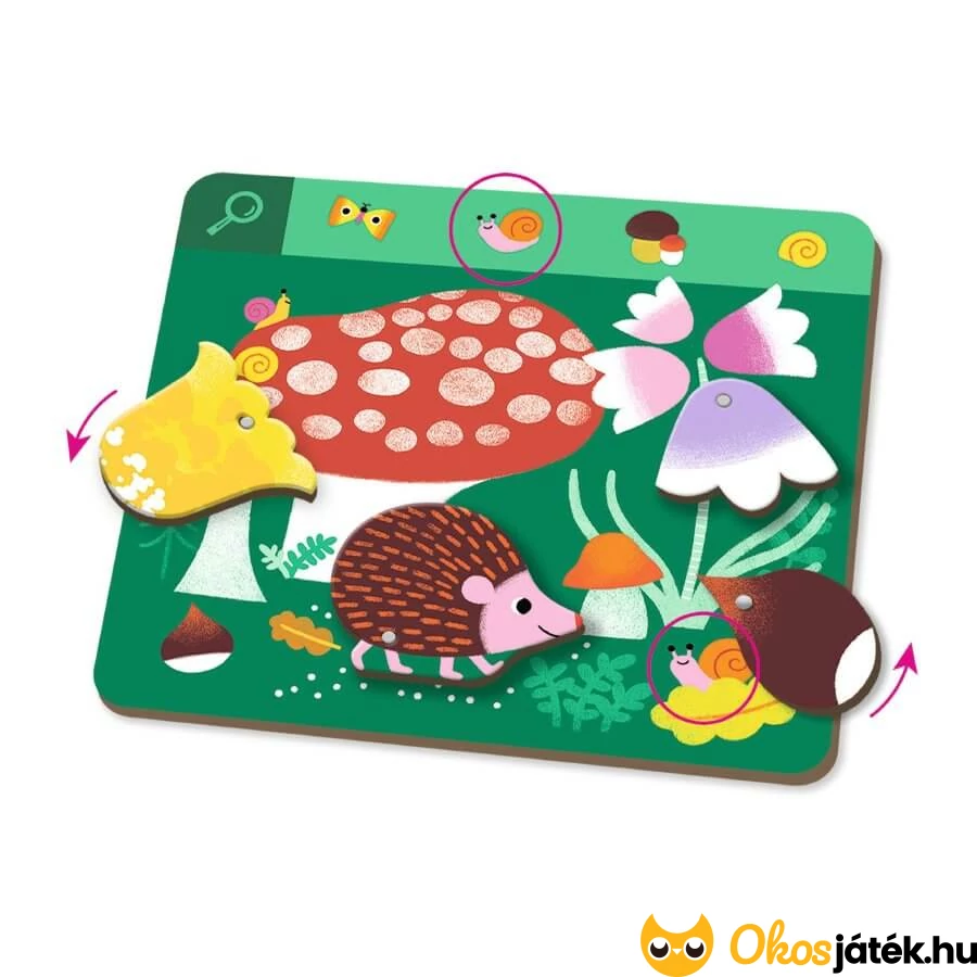 Egyes kisállatokat elforgatható elemek alá rejtettek, így még izgalmasabb a keresgélés. A gondosan rögzített elforgatható elemek miatt a játék nem csak a figyelmet, de a kézügyességet is fejleszti.