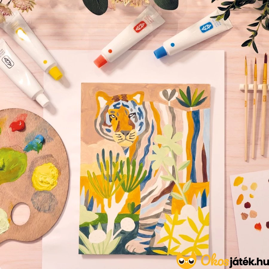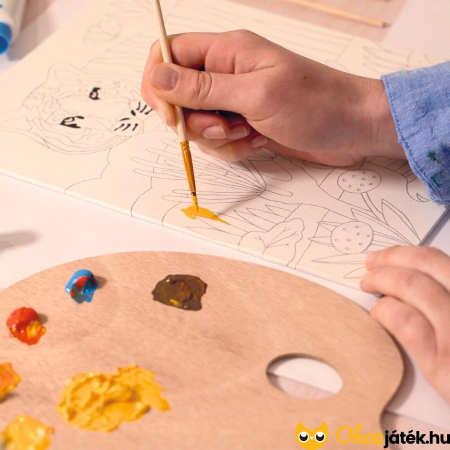 A készlet segítségével el lehet sajátítani a színkeverés alapjait, miközben az egyedi, tigrises képen rengeteg színárnyalat hozható létre mindössze négy alapszín használatával. Az akrilfestékek kiváló minőségűek, élénk színűek és tartósak, így a végeredmény látványos és időtálló lesz.