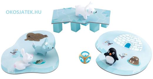 A játék megkezdése előtt: a játéktábla három darabját helyezzétek a játéktér közepére. A két jégtábla közé kerüljön a hat pilléren álló jéghíd. A négy állatkát helyezzétek a lék köré a start-jégtáblán.
