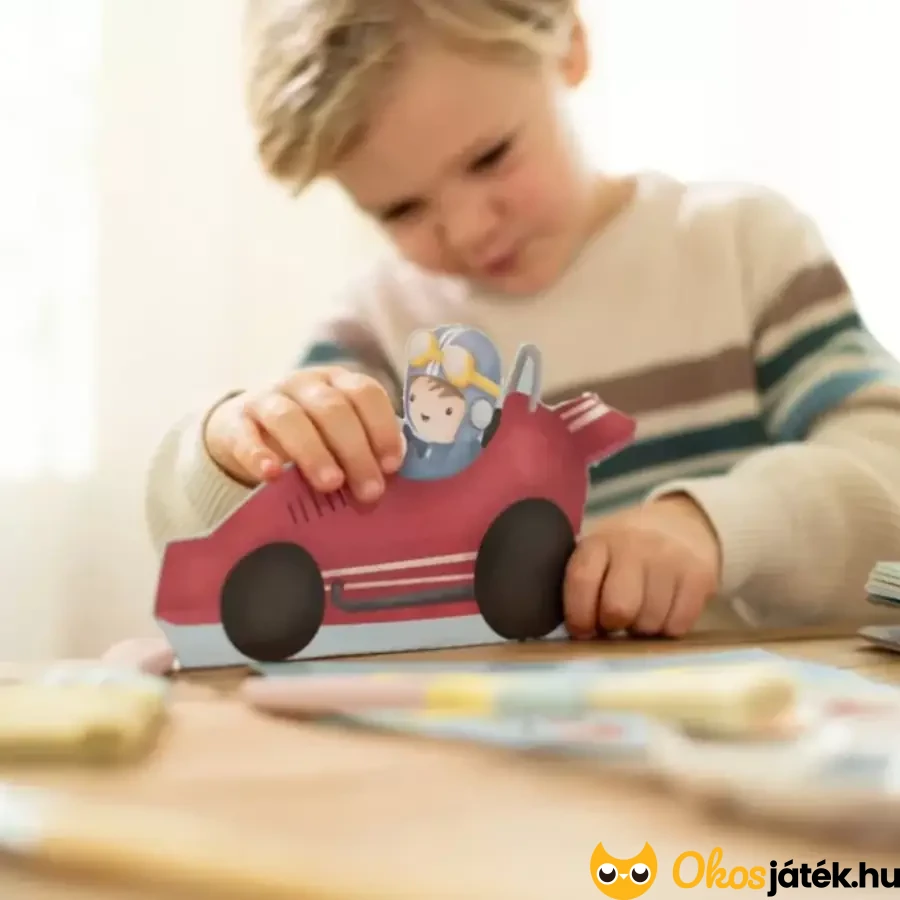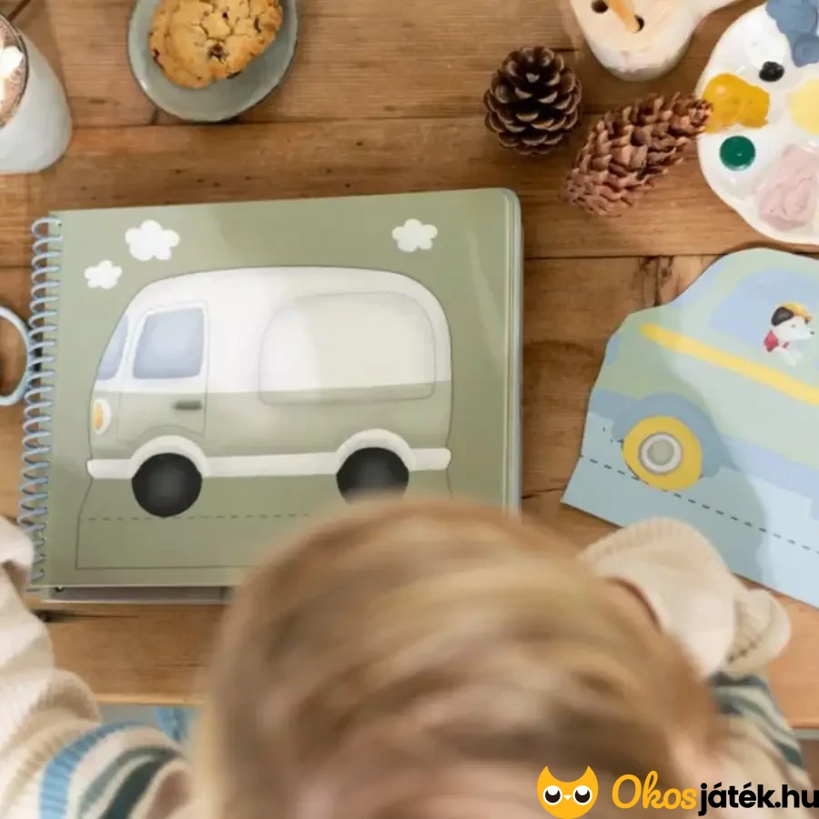 Kedves, autó készítő kreatív készlet a Little Dutchtól, már 3 éves kortól mellyel a gyerekek 20 járgányt készíthetnek el ragasztással, matricázással és vágással. A készlethez egy biztonságos műanyag olló is tartozik.