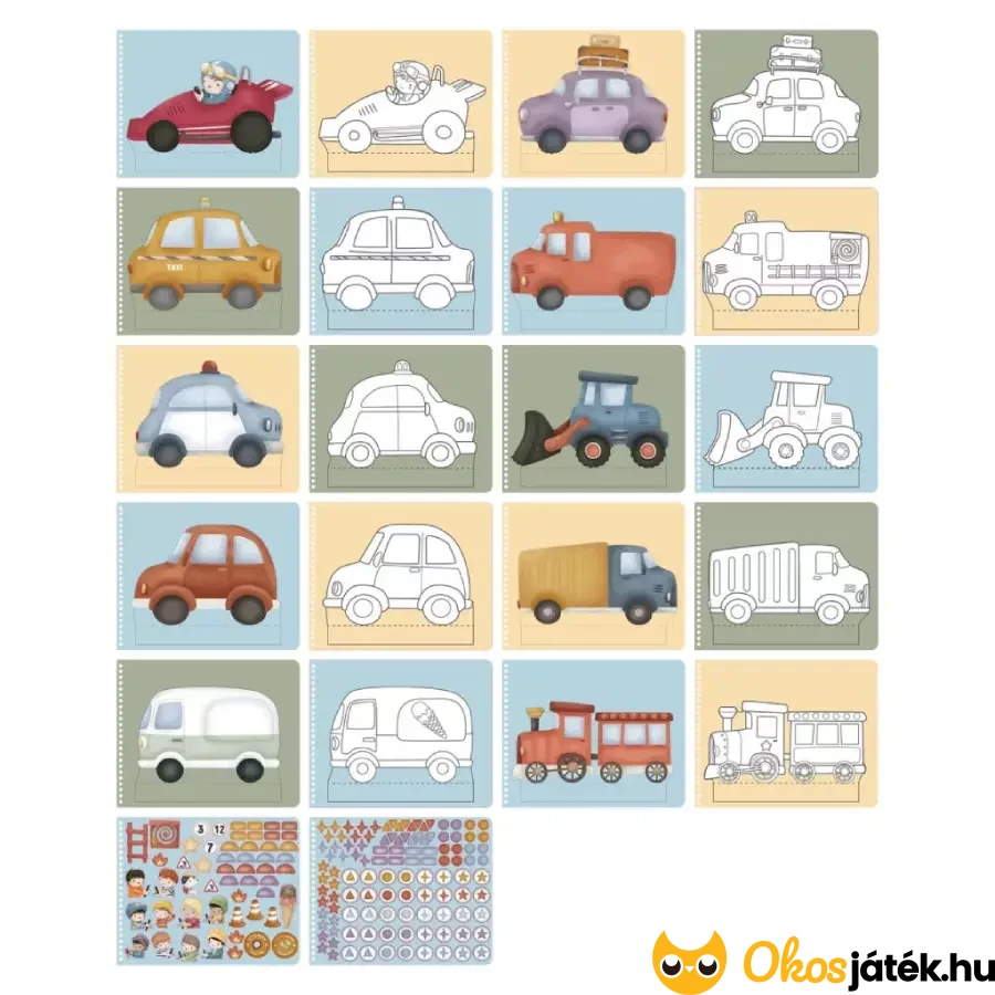 Személyautót, rendőrautót,tűzoltóautót, taxit, vonatot, vagy akár teherautót is lehet készíteni, ráadásul több mint 150 matricát lehet felhasználni az alkotáshoz. A fekete-fehér képek tetszés szerint kiszínezhetők, ezáltal egyedi járműveket lehet létrehozni. A lapok erősebb papírból készültek, így könnyebben lehet őket vágni. A járművek alatt rá van hagyva egy kisebb területet, melyet ha kivágnak a gyerekek és a jelzés mentén behajtják, megállnak majd az elkészített autók.