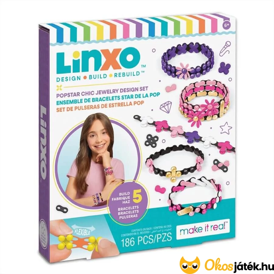 A szettel 5 karkötő készíthető rugalmas, különböző színű LinXo elemekből. Az elemekből saját kreativitásuk szerint alkothatnak a gyerekek. A karkötő könnyen variálható és újra összeállítható, így mindig megújult ékszerekben tündökölhetnek a lányok.