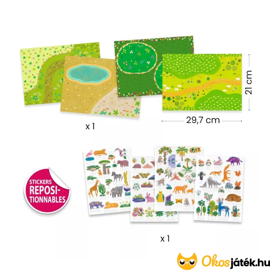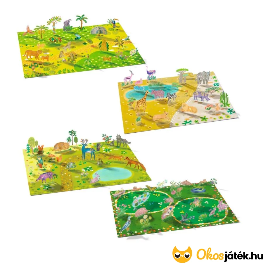 A foglalkoztató játékban 4 db színes, részletes alaplap található, az állatok és növények természetes élőhelyei, vizek és szárazföldi területek.