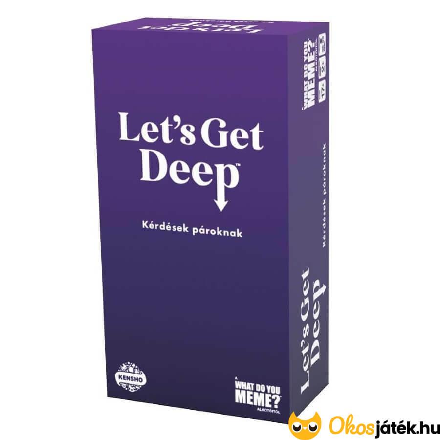 A Let's get deep játékban ideje a dolgok mélyére hatolni. Fűszerezd meg a randevút vagy ismerd meg a párodat jobban! Tegyetek fel egymásnak 3 különböző szinten/mélységben szórakoztató, kreatív kérdéseket. Ezt a kártyajátékot 18 év feletti pároknak ajánljuk.