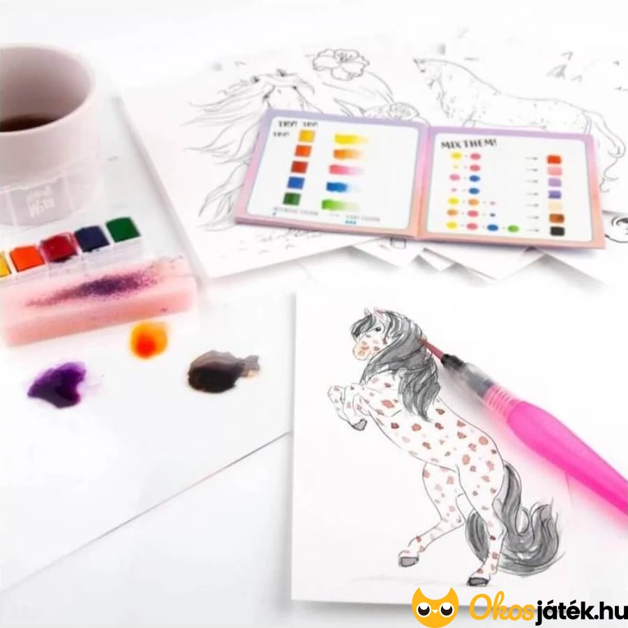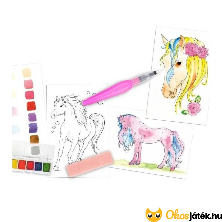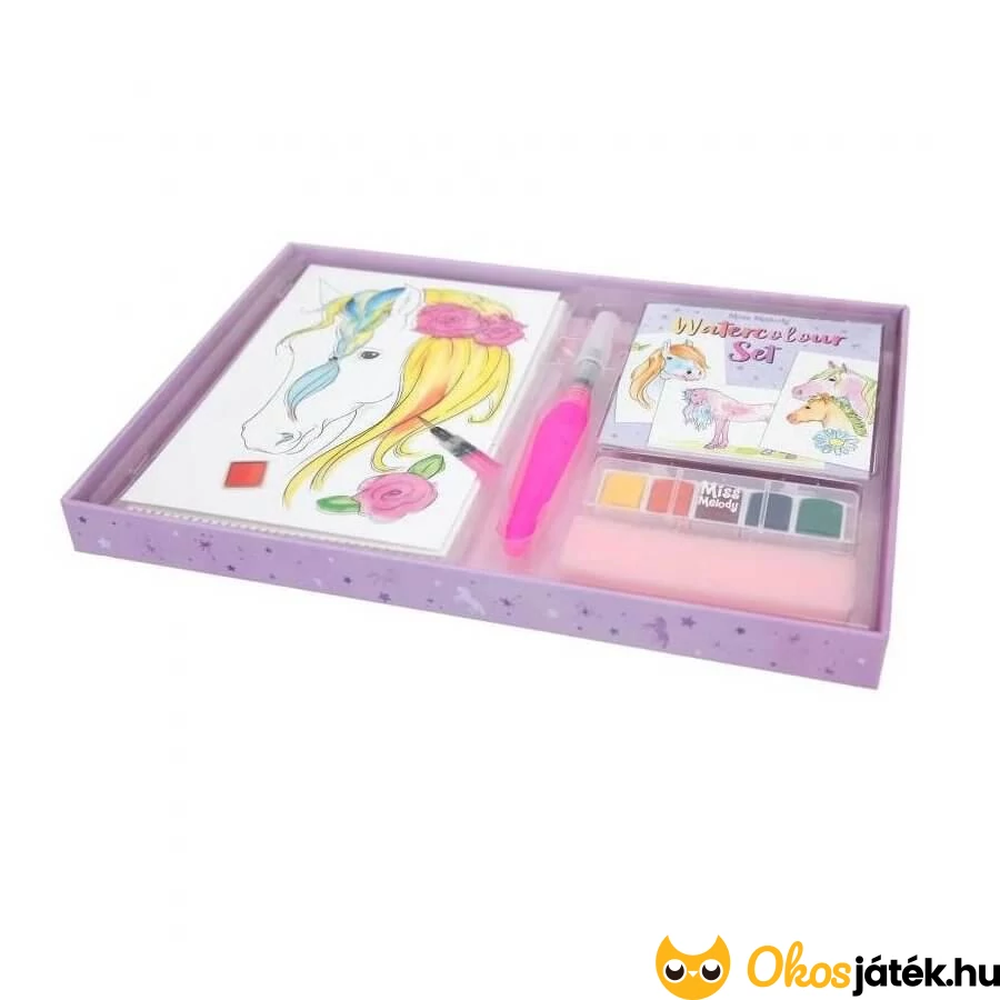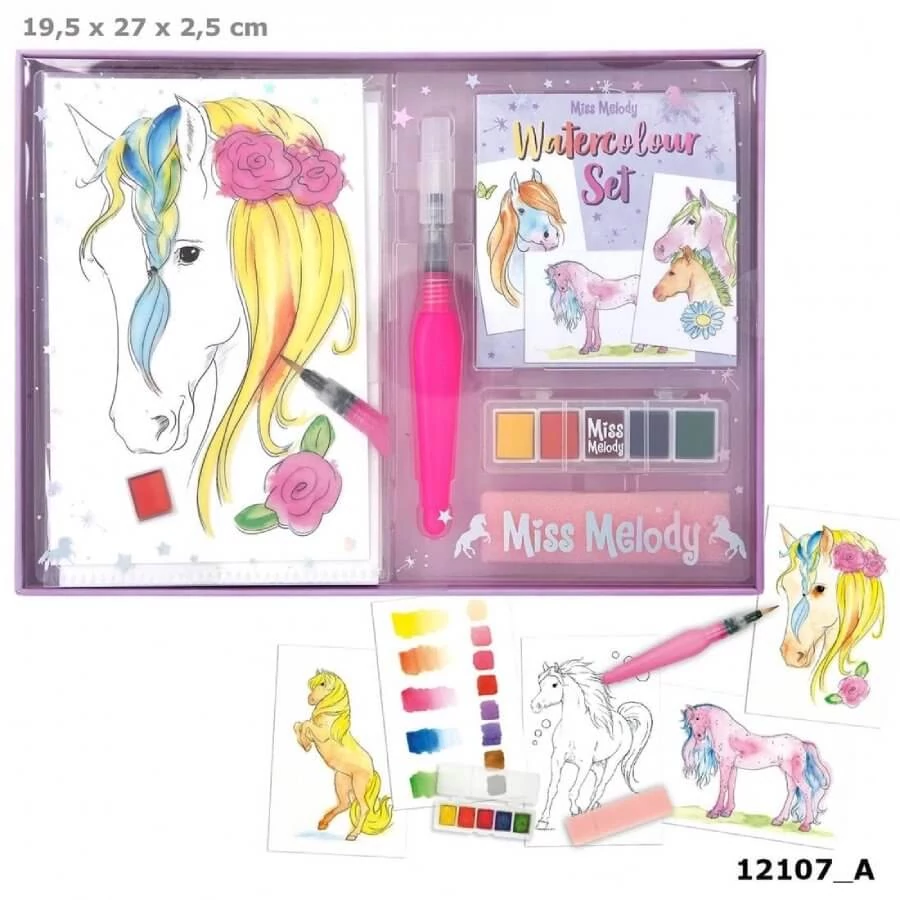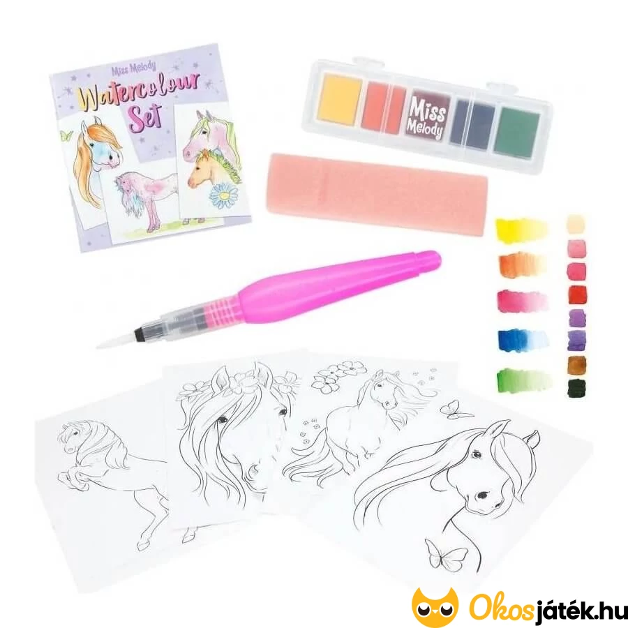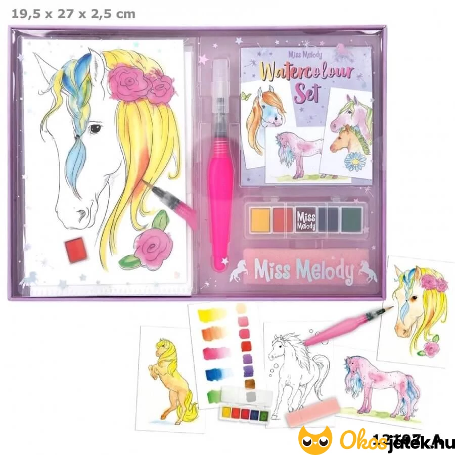 A Miss Melody vizes kifestőjével a gyermekek 20 gyönyörű lovas képet festhetnek vízfestékkel és egy speciális vízzel tölthető ecsettel. A körülbelül A5 méretű lapokon a lovacskák körvonalait láthatják a gyerekek, de az alakokat nekik kell kifesteniük.