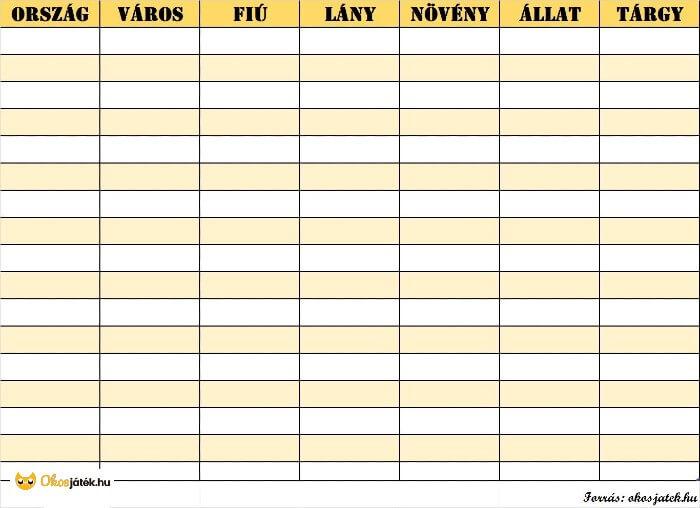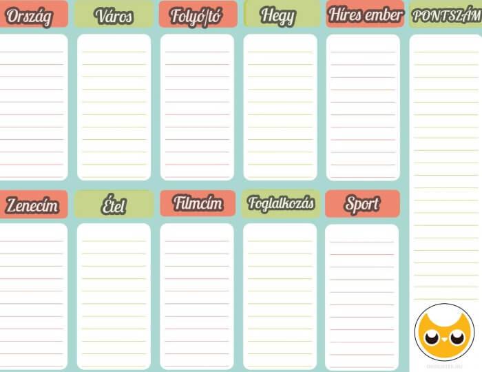 Ország, város, fiú, lány, növény, állat, tárgy és ha nagyobbakkal játszunk akkor híres ember. Utolsó oszlopba pedig írjuk fel a pontszámot.