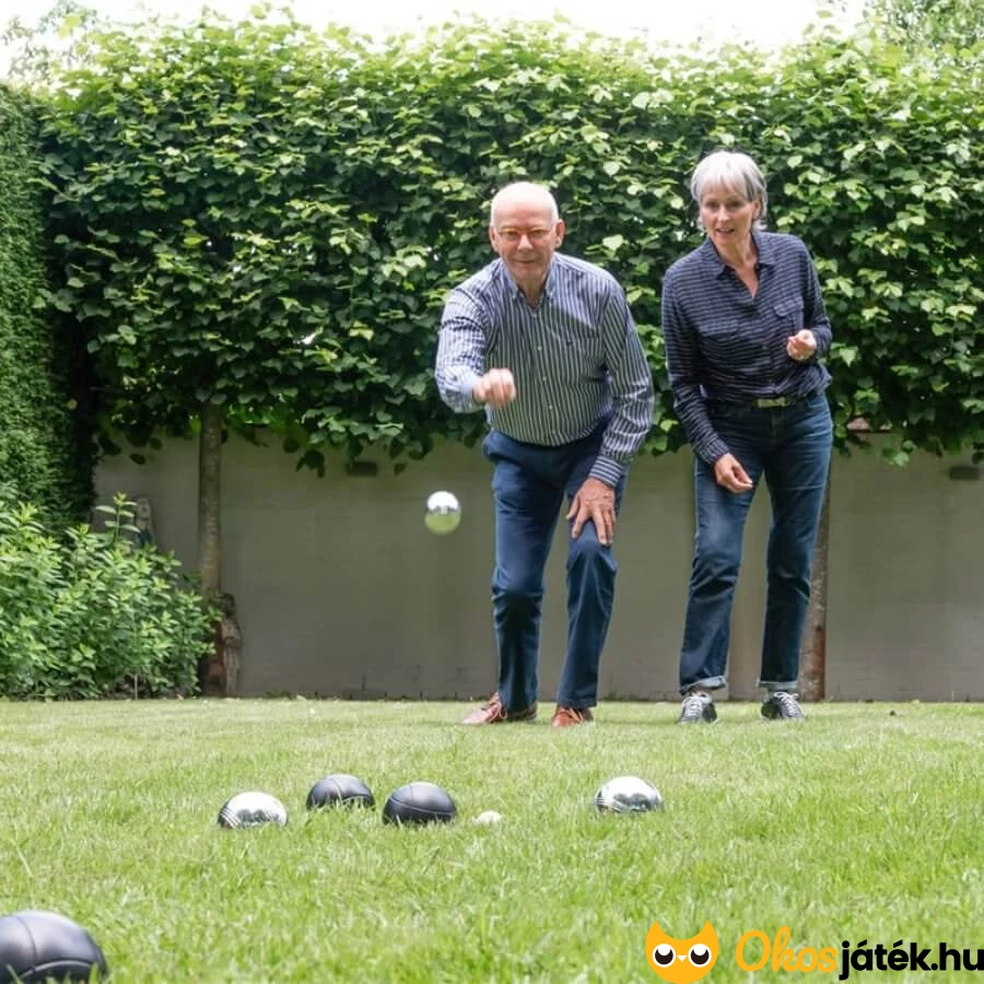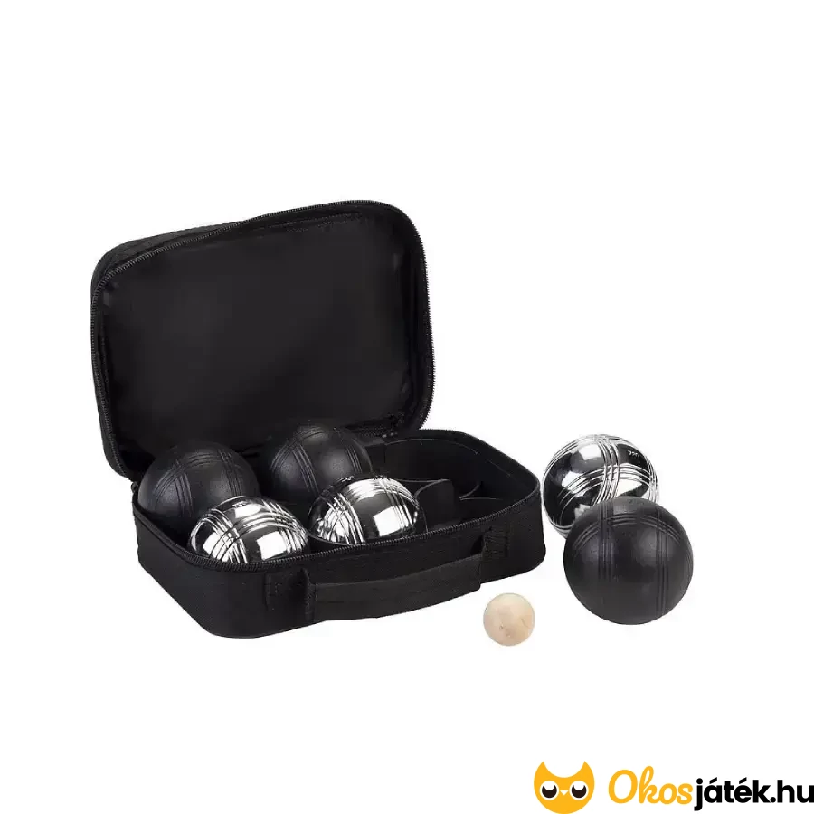 Klasszikus, minőségi kivitelű szabadtéri játék az egész család számára. A készlet 6 fém golyót tartalmaz, amelyből 3 fekete porszórt és 3 ezüst színű. A 74 mm átmérőjű és 720 gramm súlyú golyók ideális méretűek és súlyúak a pontos dobásokhoz. Öcsivel (célgolyó, franciául cochonnet), merő zsinórral, praktikus cipzáras fekete táskában kerül forgalomba, így könnyen szállítható és tárolható.
