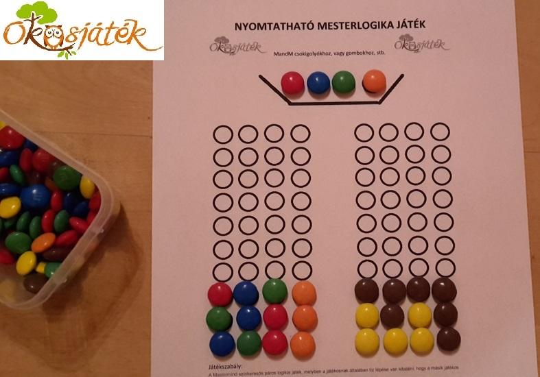 Készíthetsz Mesterlogika játékot egy papírlap, íróeszköz és mondjuk M&M csokigolyók segítségével. Mi úgy játszottuk, hogy aki kitalálta a színkódot, ehetett három csokit. Lehet gombokkal is játszani ha van otthon sok színes pici gomb. A Mastermind színkeresős páros logikai játék, melyben a játékosnak általában tíz lépése van kitalálni, hogy a másik játékos milyen színkombinációt rejtett el.
