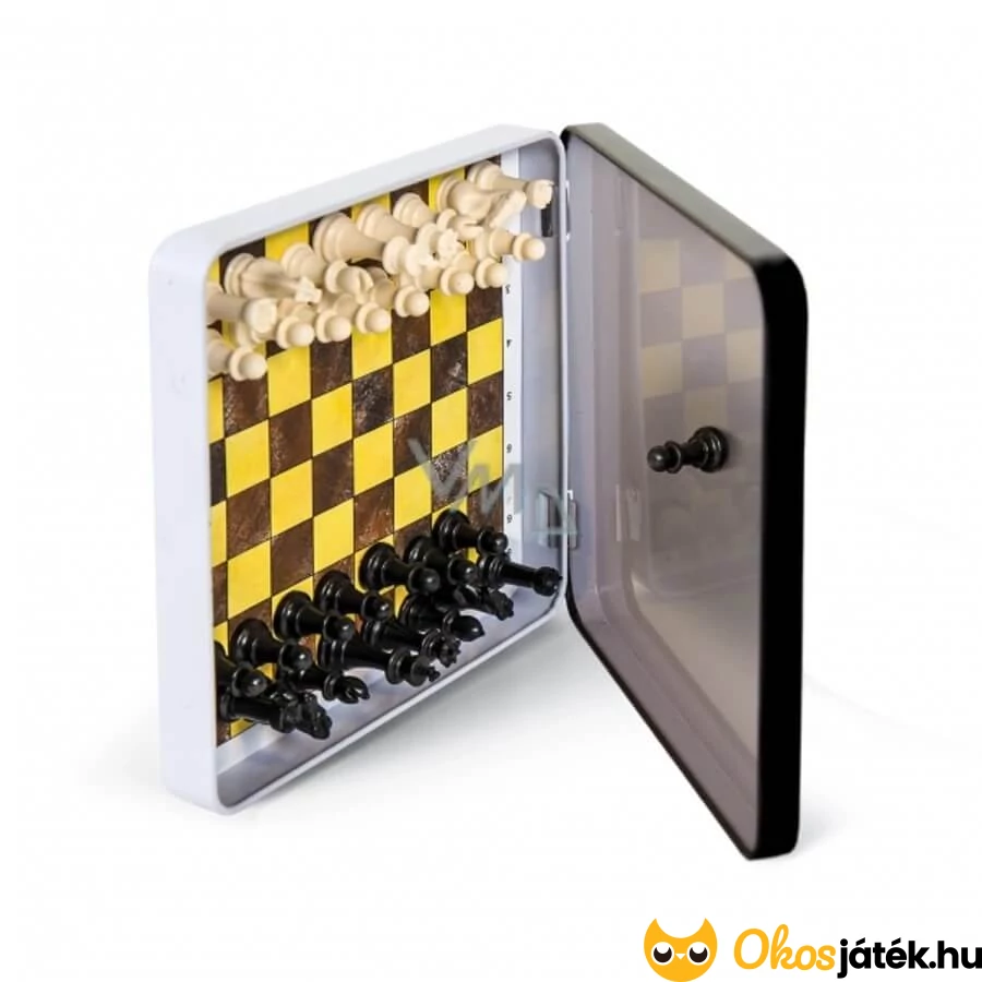 Mini fémdobozos sakk készlet, melynek belsejében találjuk a sakk játékteret, és abban tárolhatjuk a pici sakkbábukat.