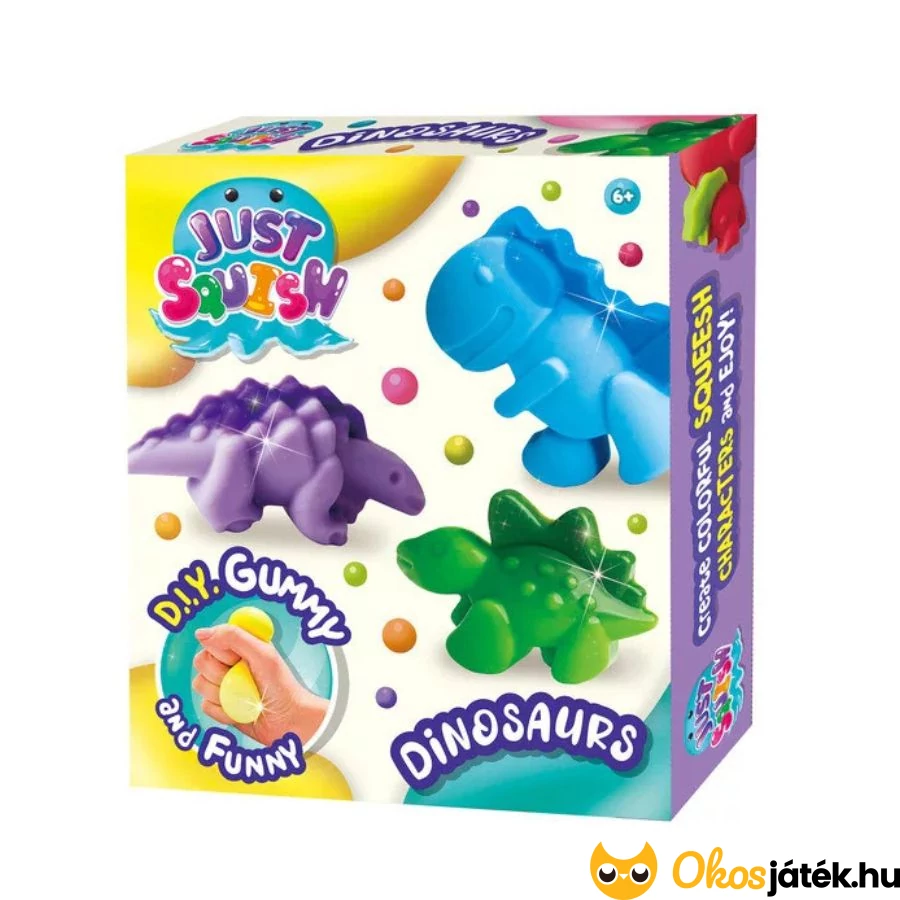 A készletben található színes és könnyen formázható anyag nem szárad ki, így a játék bármikor folytatható. A „squish” vagy „squishy” olyan puhán összenyomható, rugalmas, stresszlabda-szerű játék, amit jó érzés kézben gyömöszölni. Ezzel a készlettel dínó formájú, puha, nyomkodós figurákat készíthetnek a gyerekek.