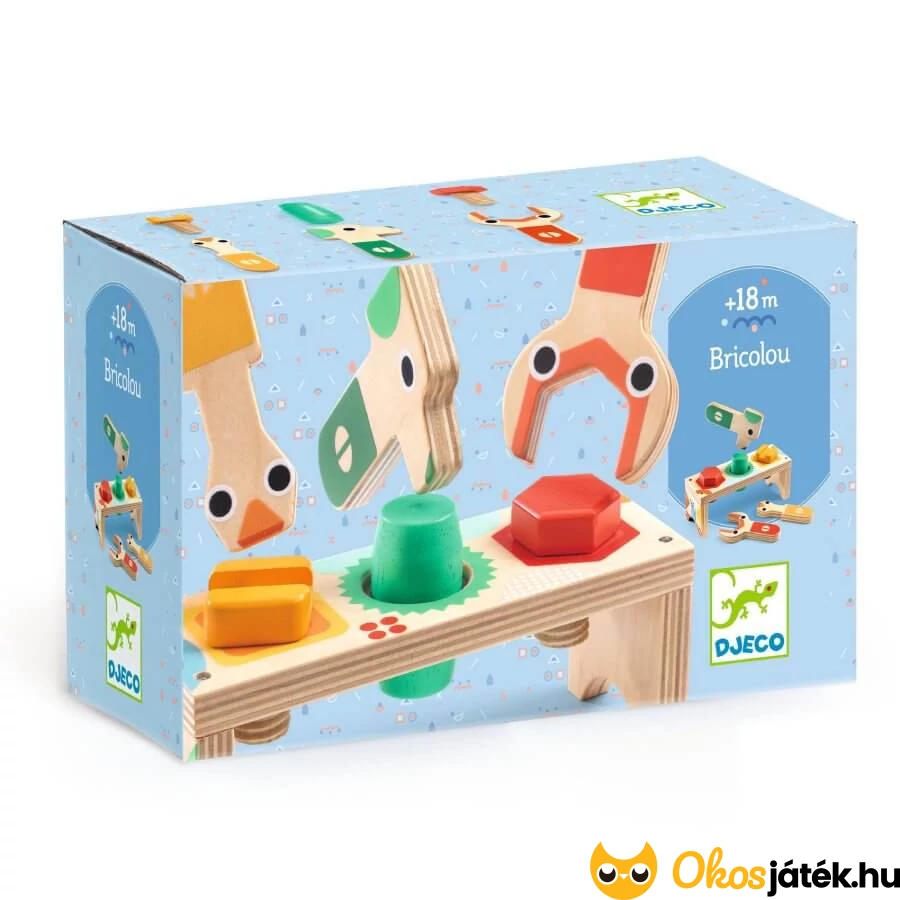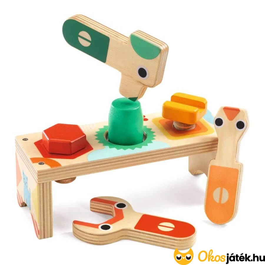 A Djeco fejlesztőjáték minden eleme fa, élénk színekkel díszített, a szerszámok funkcionálisak, könnyen kezelhetők a kicsik számára. A szerelő alap stabil, a csavarok nagyok, ami megkönnyíti a műveletet.